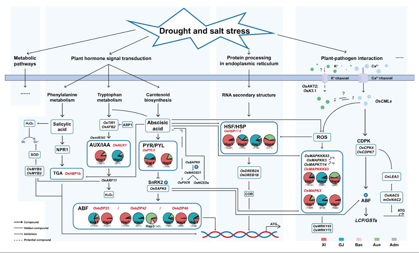 近日,安徽农业大学农学院在中科院生物类Top期刊(IF=5.924)International Journal of Molecular Sciences(IJMS)发表题为“Candidate Genes and Pathways in Rice Co-Responding to Drought and Salt Identified by gcHap Network”(https://doi.org/10.3390/ijms23074016)的研究性综述论文。在系统介绍水稻盐旱机制的同时,结合转录组分析筛选到1748个盐旱共响应基因,主要富集在植物激素信号传导、内质网蛋白调控,MAPK等重要通路,进而对其中的核心基因进行功能单倍型网络分析,构建了“gcHap-network pathway”的盐旱共响应机制框架图。同时整理了近900份耐盐抗旱水稻品种,分析发现在重要亲本中大多包含上述核心基因及有利单倍型,为将来进一步进行系统验证和分子设计育种提供了重要参考。