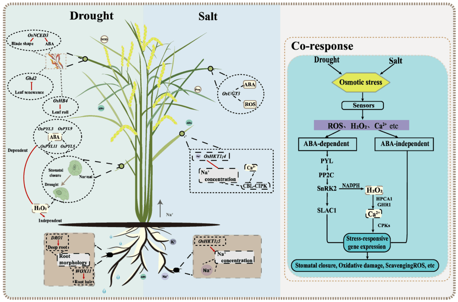 干旱和盐害是制约水稻产量的重要非生物胁迫,相关功能基因的研究始终是领域内的热点。然而,由于抗逆性状的复杂性及影响因素的多样性,针对盐旱共响应的多胁迫作用机制仍不明确,如何有效利用抗逆功能基因组学的研究成果进行设计育种,也是后基因组时代水稻育种的关键问题。