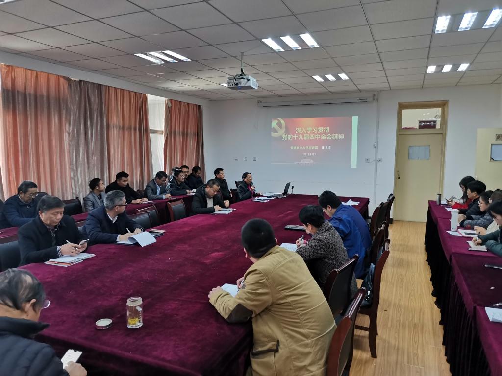 本网讯 12月11日,为深入学习宣传贯彻党的十九届四中全会精神,安徽农业大学宣讲团成员、农学院党委书记汪凤莲在十教518室为全体教工开展了十九届四中全会的宣讲报告。