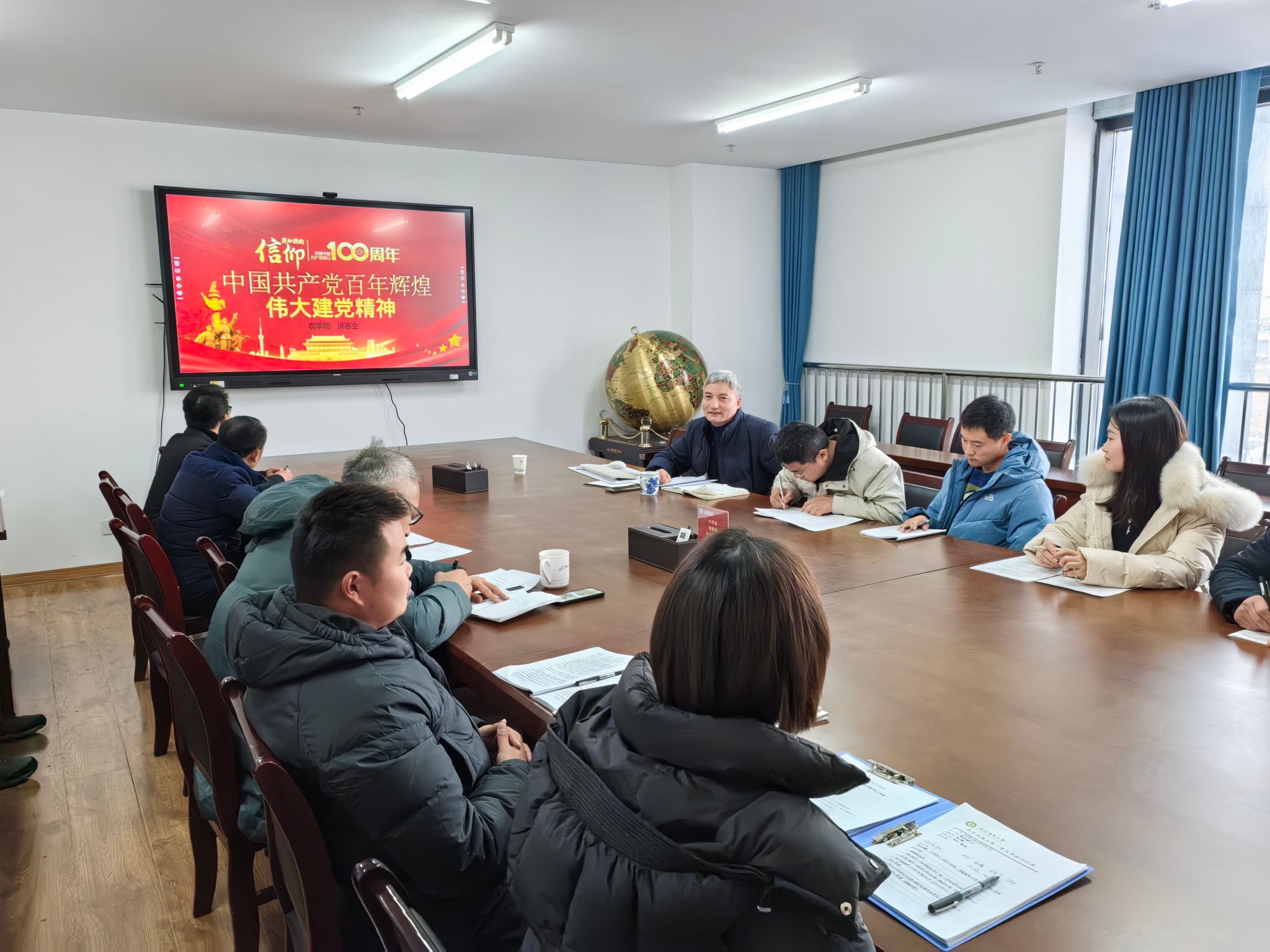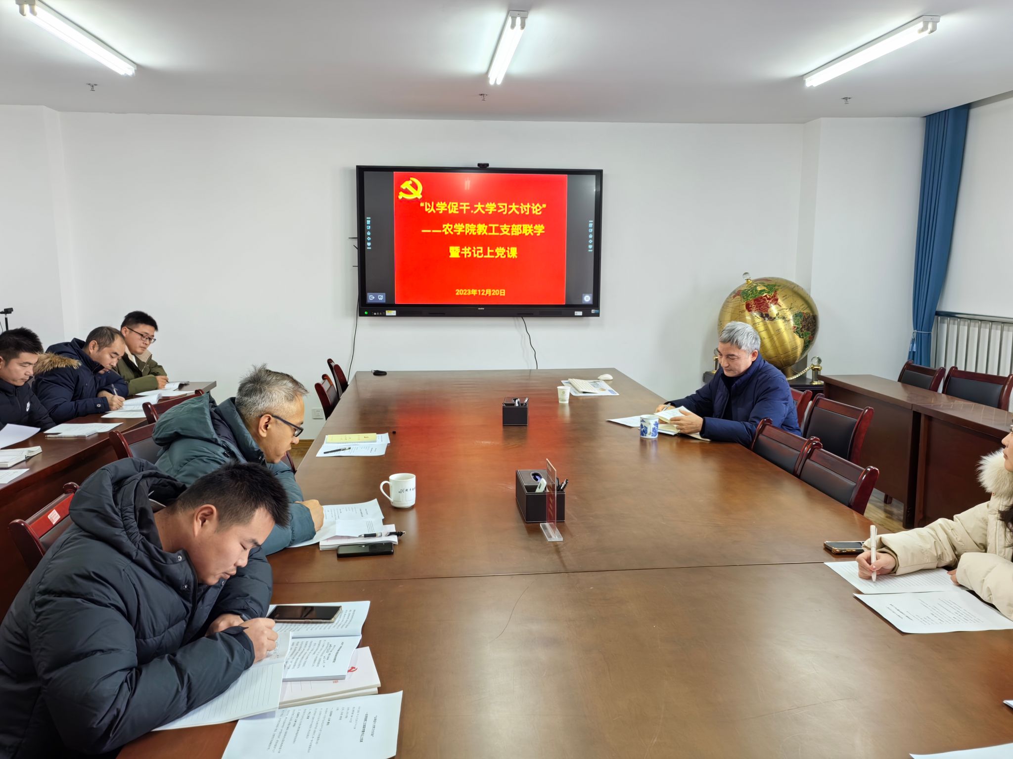 本网讯 12月20日下午,农学院教工第一党支部和第二党支部党员齐聚朝阳楼206会议室,开展“以学促干·大学习大讨论”专题联学暨书记上党课活动,会议由支部副书记车钊、支部书记黎珉主持。