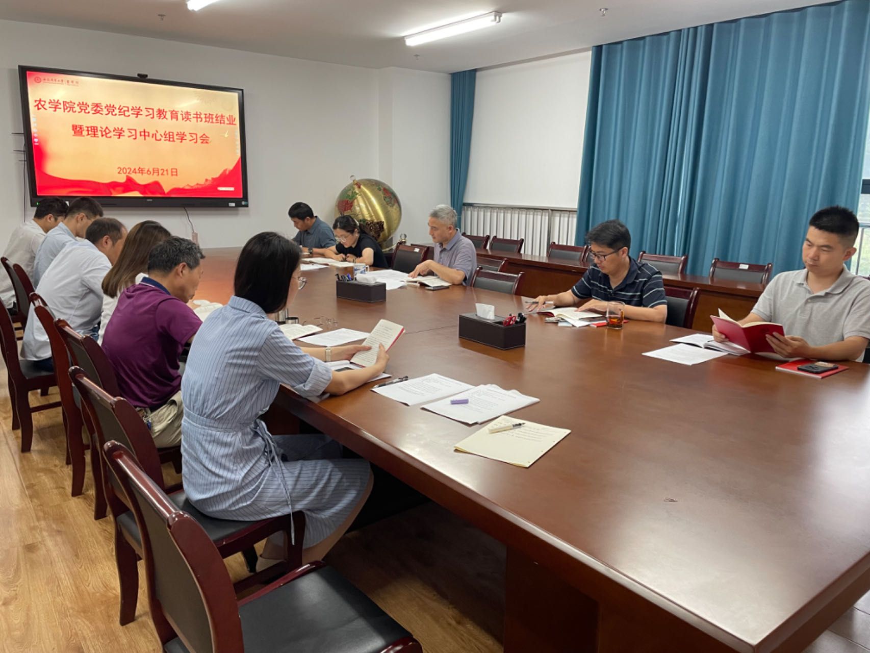 本网讯 6月21日下午,农学院在朝阳楼206会议室召开党纪学习教育读书班结业暨党委理论学习中心组会议。学院党委书记洪志生主持会议,并以《习近平关于党的自我革命的重要思想的解读》为题讲授专题党课。学院党委委员、党支部书记参加会议。