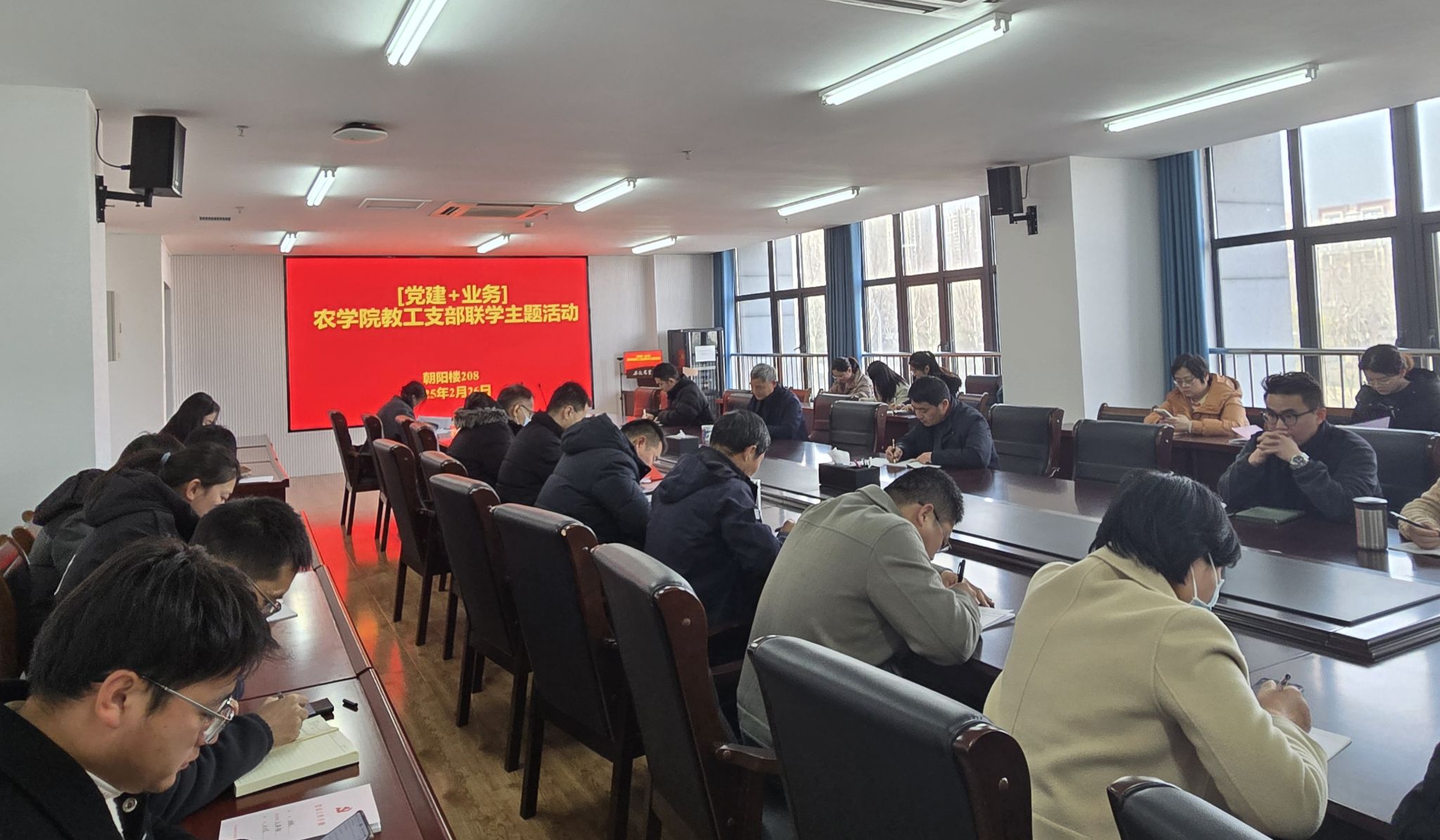 本网讯 2月26日下午,农学院教工第一和第二党支部齐聚朝阳楼208开展“党建+业务”联学主题活动,会议由党支部书记黎珉和陈翔共同主持,全体支部党员参会。