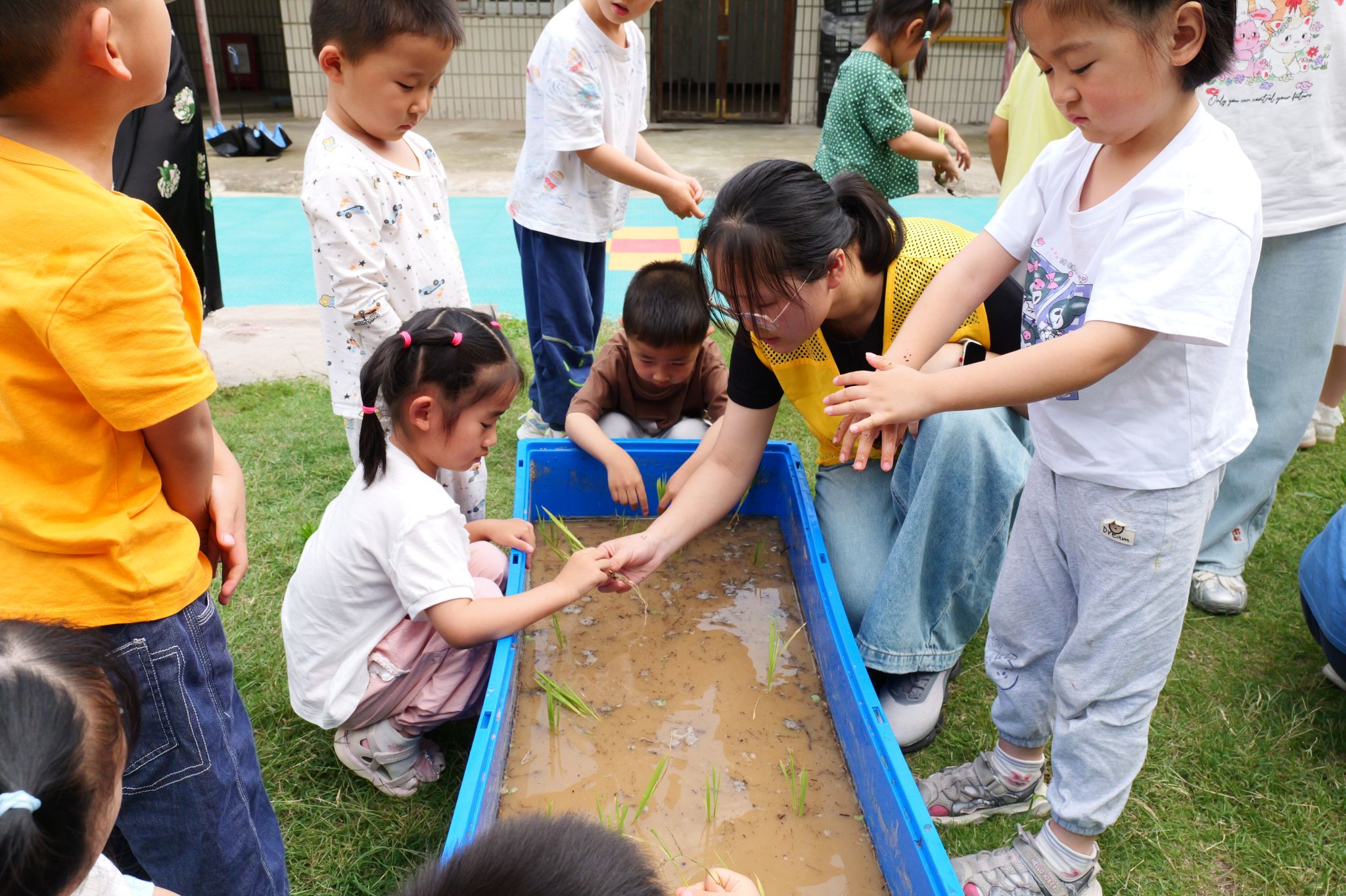 与此同时,幼儿园内的小水田边也是一片忙碌景象。中一班和中三班的小朋友们在农学院李笑笑老师、工人及志愿者的指导下,认真地学习插秧。李笑笑老师耐心示范:“小手捏紧秧苗,轻轻往下插,让它们稳稳‘站’在泥土里。” 志愿者们手把手辅助,鼓励孩子们大胆尝试。起初还有些怯生生的小朋友,逐渐放开手脚,一株株嫩绿的秧苗在水田里整齐排列,看着自己的劳动成果,孩子们脸上洋溢着自豪的笑容。