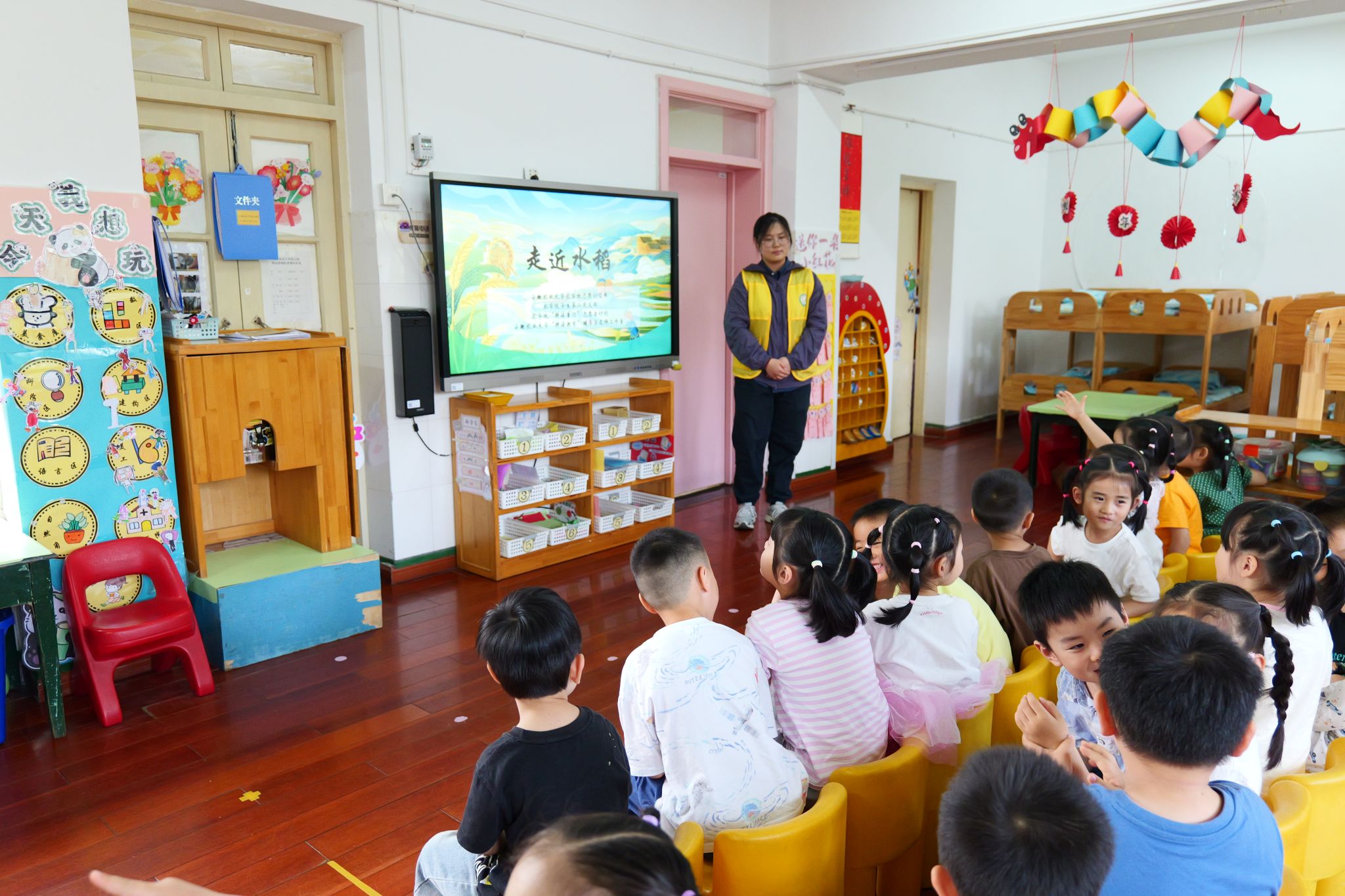 学院学生党员、入党积极分子、青年团员们积极发挥模范带头作用,踊跃报名、积极备课、认真授课。活动开始前,幼儿园中班和小班的小朋友们在教室跟随志愿者,通过精心制作的课件学习农耕知识与安全事项。课件以动画形式展示小麦生长过程、水稻插秧技巧,搭配儿歌与趣味问答,充分吸引了孩子们的注意力,让他们踊跃参与其中。面对“小麦怎样变成面粉?”等提问,教室里小手林立,孩子们积极回答。在互动中,他们了解到农耕的辛苦,也明白了粮食的来之不易。志愿者还反复强调实践安全,如观看打小麦需保持距离、插秧时注意防滑,小朋友们认真聆听,频频点头,将安全知识牢记心间。