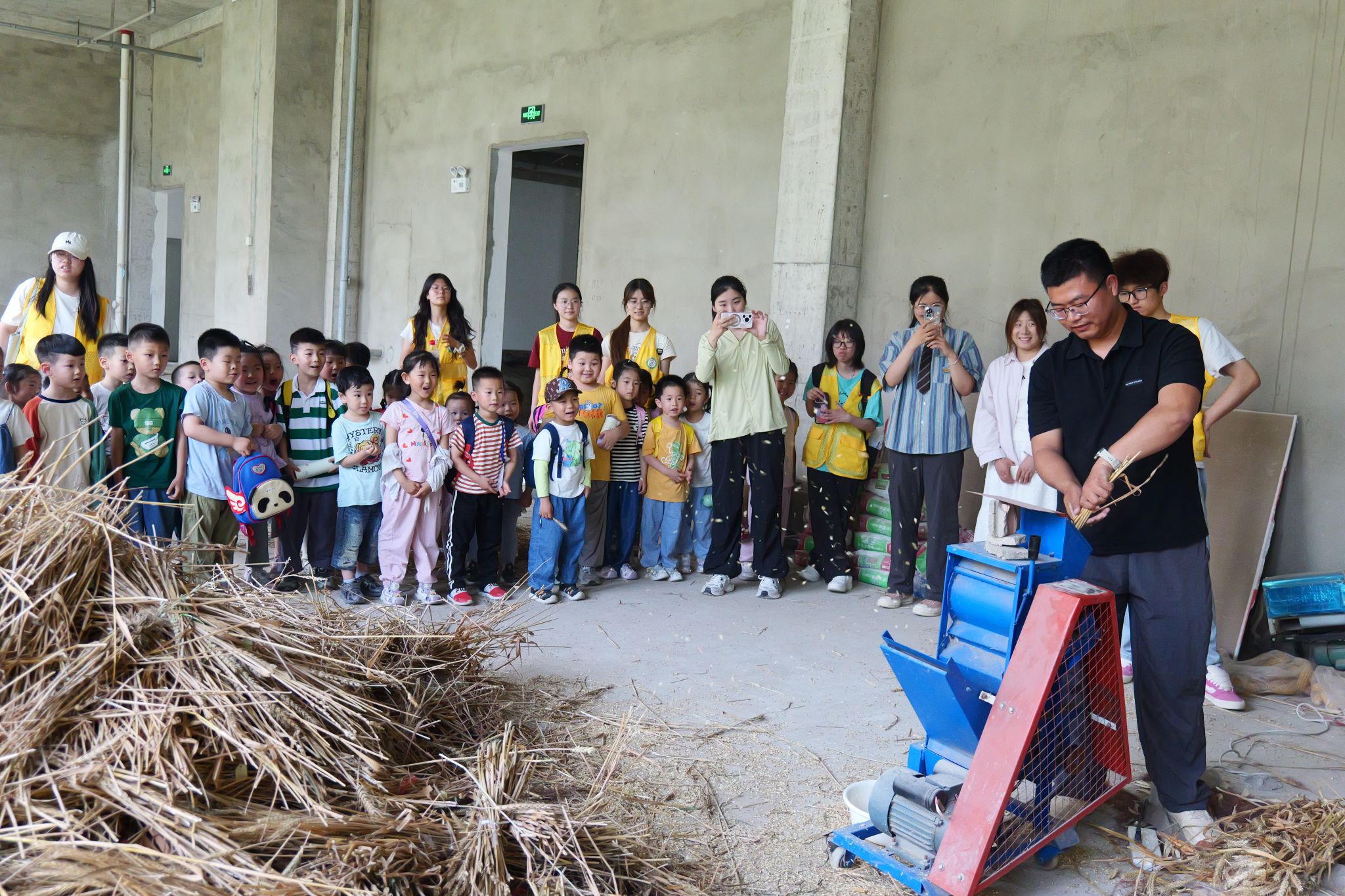 完成知识学习后,小朋友们兵分两路,踏上不同的农耕体验之旅。在朝阳楼一楼,中二班和小三班的小朋友们带着满满的好奇围在志愿者身边,聚精会神地观看打小麦过程。志愿者们一边熟练操作脱粒机,一边生动讲解:“瞧!小麦宝宝要从麦穗妈妈的怀抱里‘蹦’出来啦!” 随着机器的运转,麦粒簌簌落下,孩子们发出阵阵惊叹,不时伸手触摸这些新鲜脱粒的 “小宝贝”,眼中满是新奇与兴奋。