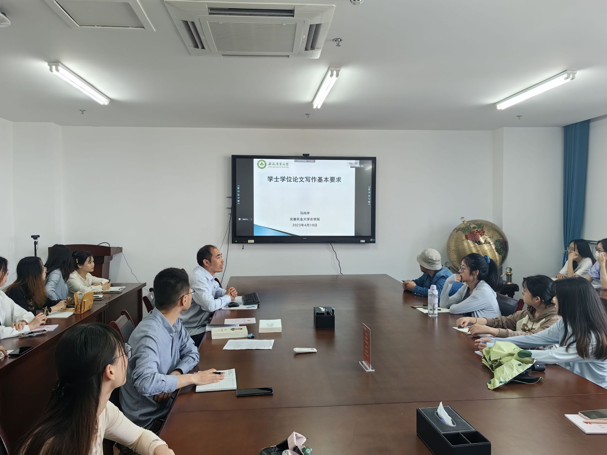 车钊首先介绍了本次活动的意义,讲解了做好毕业论文的重要性,要求同学们高度重视毕业论文的写作。马尚宇老师结合安徽农业大学本科生毕业论文(设计)管理工作的暂行规定和2023年本科毕业论文(设计)工作的具体安排,对本科生论文写作目的、框架、内容和具体写作方法与要求,结合以往辅导毕业生论文的实际经验,深入浅出的讲解,针对性地解决了同学们的困惑,为毕业生上了一堂生动而具有深刻意义的专题辅导课。