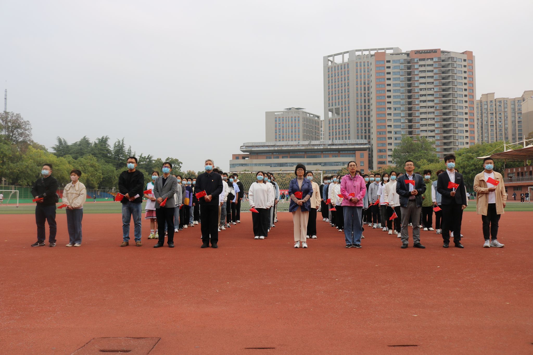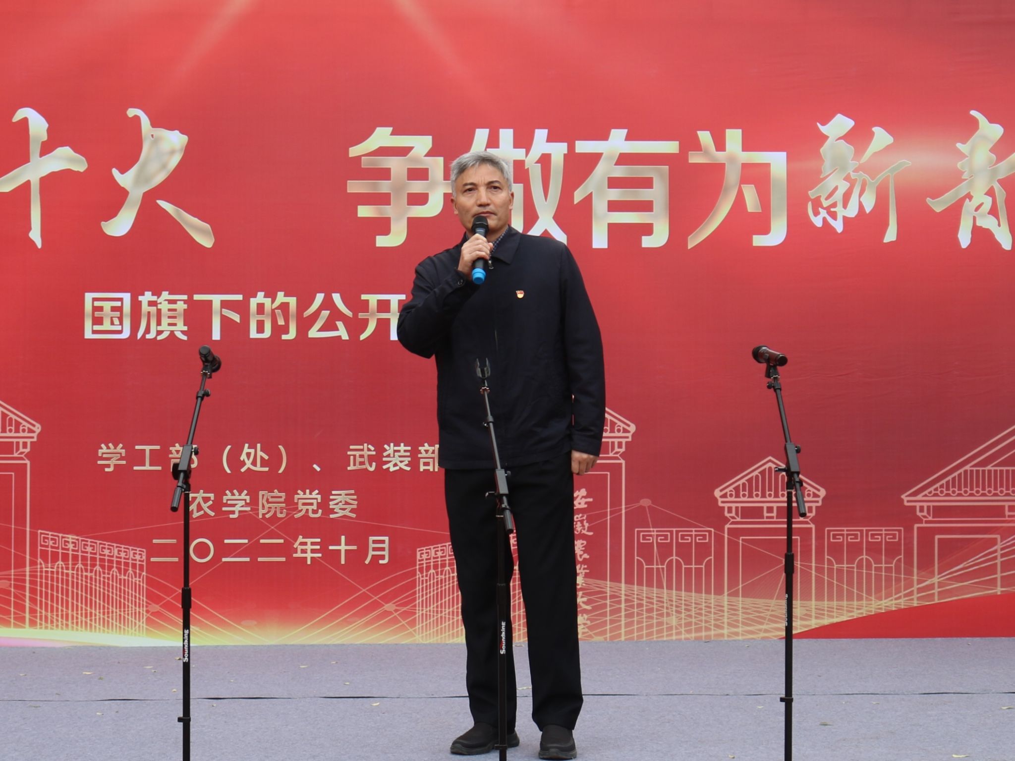 (本网讯)10月17日清晨7点整,农学院在校第一运动场举行“献礼党的二十大 奋进新征程”升旗仪式暨“国旗下的公开课”主题教育活动。学工部(处)处长姚莉、副处长刘柳,学院党委书记洪志生、副院长宋贺,全体专职辅导员和农学院80名2022级本科学生代表参加此次活动,活动由专职辅导员彭琼琼主持。