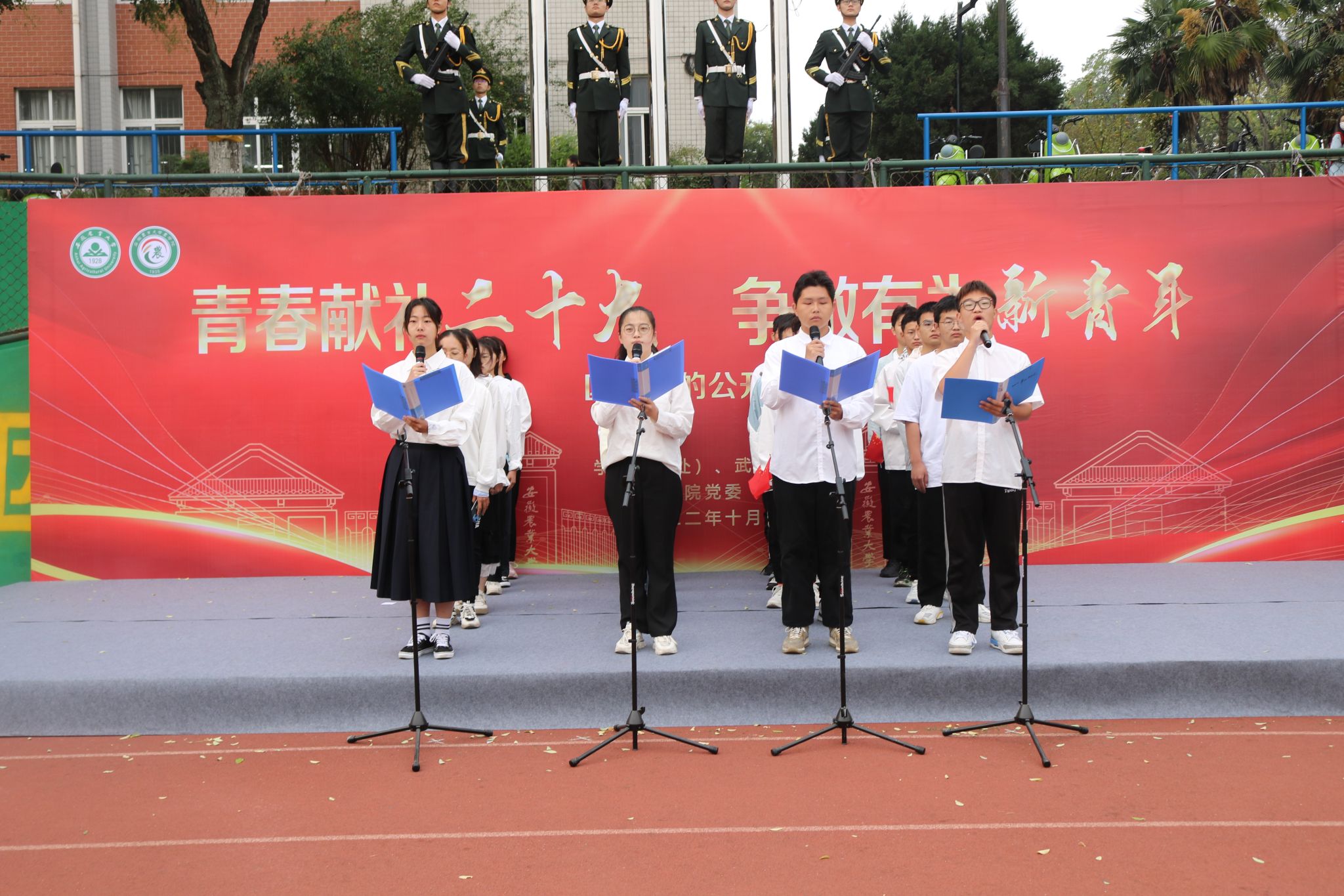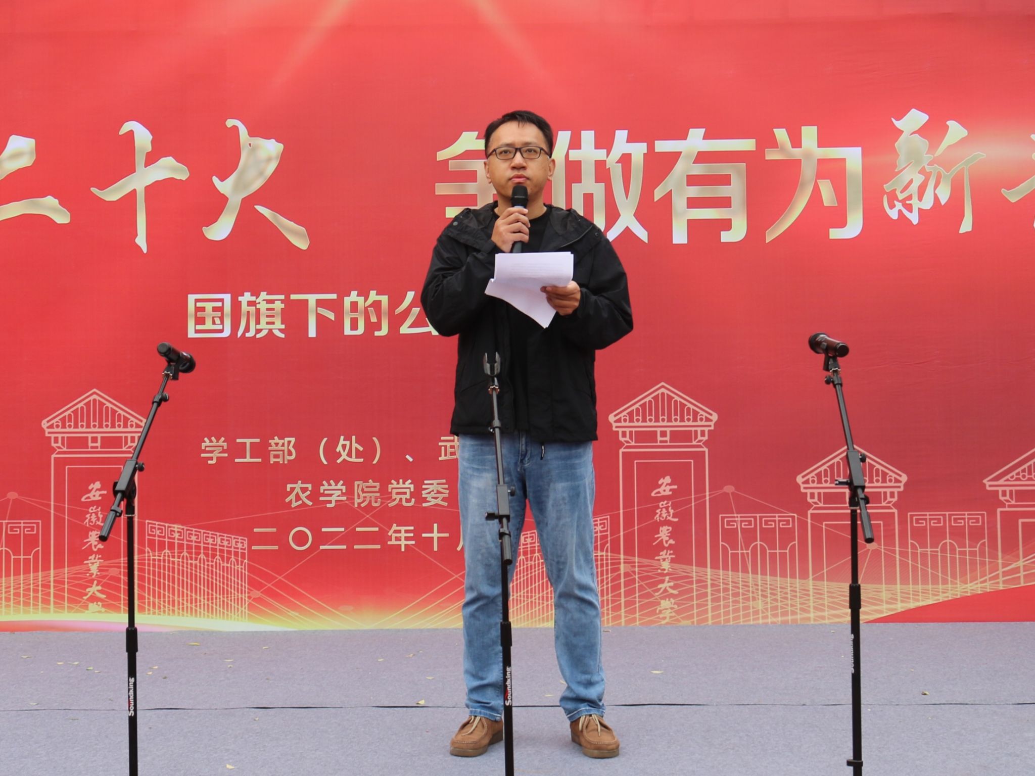 吴先浩等24名本科生带来了《献礼党的二十大,永远跟党走,奋进新征程》的主题诗歌朗诵,他们对党致以青春的礼赞,对祖国许下青春的誓言,“请党放心,强国有我!请党放心,强农有我!”。