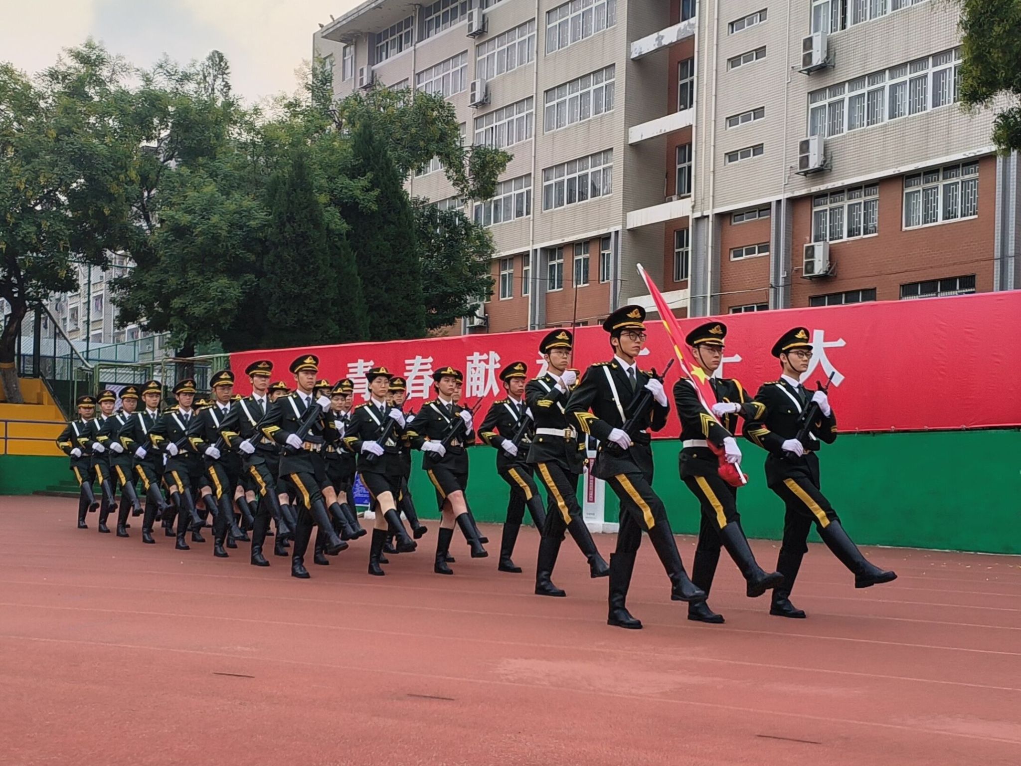 迎着朝阳,国旗护卫队迈着铿锵的步伐,英姿飒爽的护送国旗,随着《义勇军进行曲》的旋律响起,五星红旗冉冉升起、迎风飘扬,全体师生庄严肃立,行注目礼。