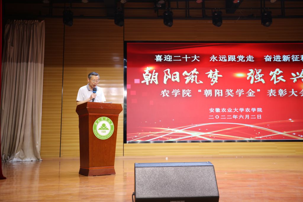 本网讯 6月2日晚,为迎接党的二十大胜利召开,贯彻落实全国全省教育大学精神,农学院在欣苑四楼学生活动中心举办“朝阳奖学金”表彰大会。校党委常委、纪委书记陈文兵、学生处处长姚莉、研究生院副院长姜家生、校团委副书记张志平,农学院党政领导出席此次表彰大会并为获奖学生代表颁奖,学院“朝阳奖学金”获奖学生、各年级研究生本科生代表参加大会。