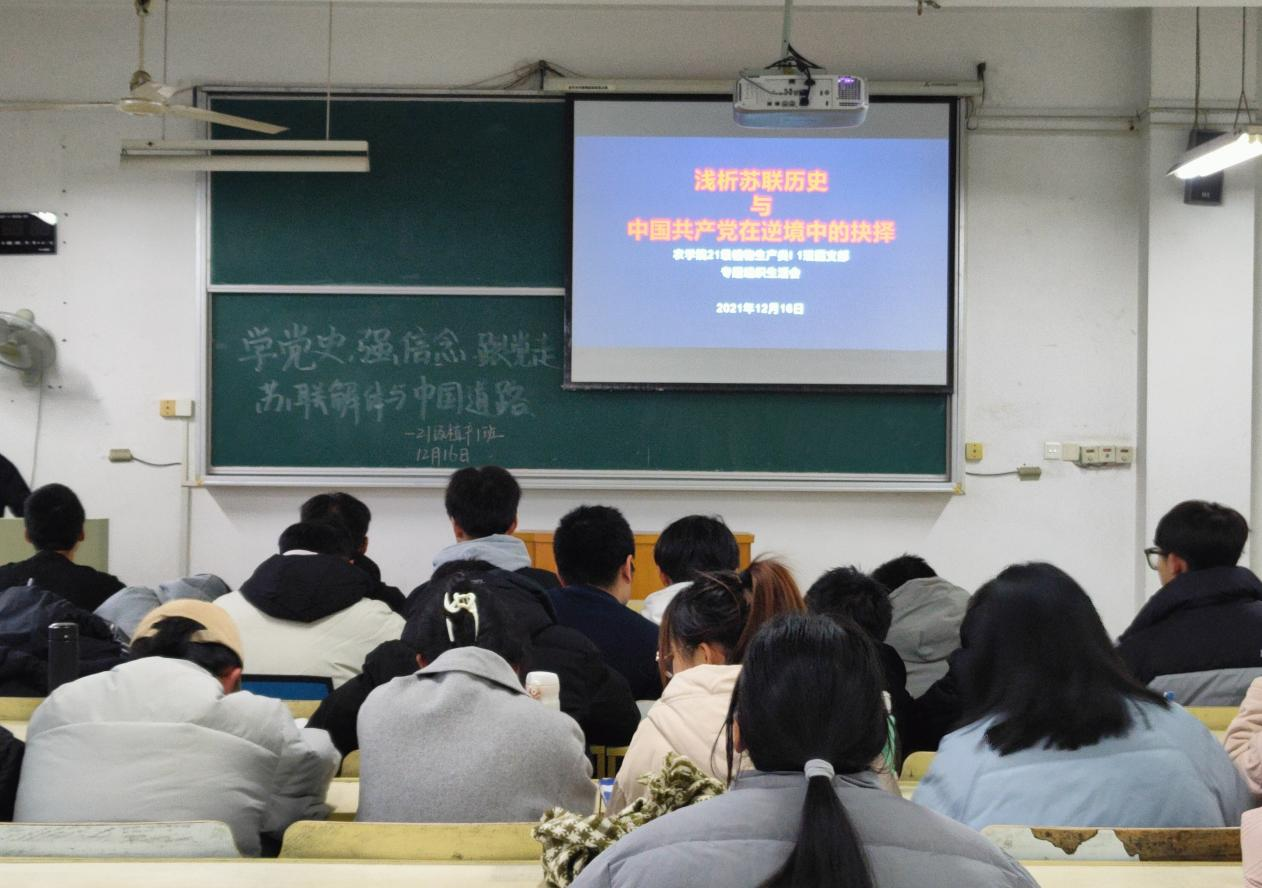 本网讯 为引导同学在知信行中悟初心、践使命,在学思践悟“党史”中成长成才,21植物生产1班于12月16日下午在勤学楼516教室扎实开展党史学习教育。本期党史教育会围绕苏联解体与中国道路主题,浅析苏联历史与中国共产党在逆境中的抉择。