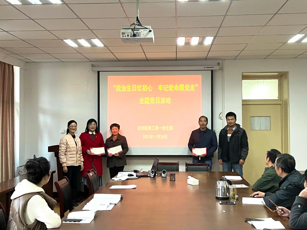 活动上,支部向11月份过“政治生日”的三位党员同志们赠送了精心准备的政治生日贺卡,支部全体党员共唱红歌献上祝福。在“共产党辛劳为人民”的歌声中,三位党员翻开手中的贺卡,一起回顾入党时的初心,重温党员的使命,激动地发表了感言。他们说道,身处这个时代倍感幸运,中国共产党带领中国人民从站起来到富起来再到强起来,从电报到智能手机,从煤油灯到万家灯火,我们一起见证着历史的变迁,共同参与着一个伟大民族向着未来的行进。作为一名老师,要继续坚持学术与产业互融的创新之路,丰富政治理论学习,积极参与学习实践,在教学与科研创新中践行共产党员的誓言。在交流中,院党委书记管志权指出,作为农科高校教师党员,更应铸牢思想根基,聚焦立德树人根本和强农兴农己任,发挥党员先锋模范作用,为乡村振兴和农业现代化建设服务。最后,全体党员重温入党誓词、面向党旗宣誓,提醒自己牢记党员身份,不忘入党初心、坚守使命职责。