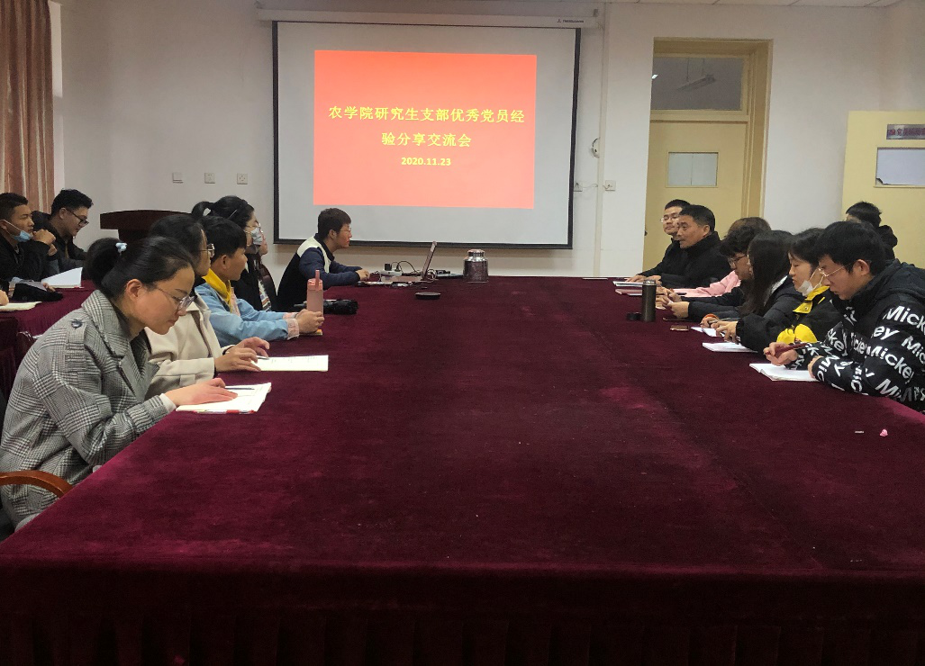 本网讯 为了宣传推广国家奖学金获得者的优秀事迹,充分发挥研究生国家奖学金获得者的典型示范作用,激发广大研究生的学习热情,11月23日中午,农学院研究生第一、二支部共同主办的优秀党员经验分享会在十教518举行。农学院2020年国家奖学金获得者刘小双博士、王军博士、支部全体党员和入党积极分子参加了交流大会,本次活动由支部书记卢杰和陈翔共同主持。