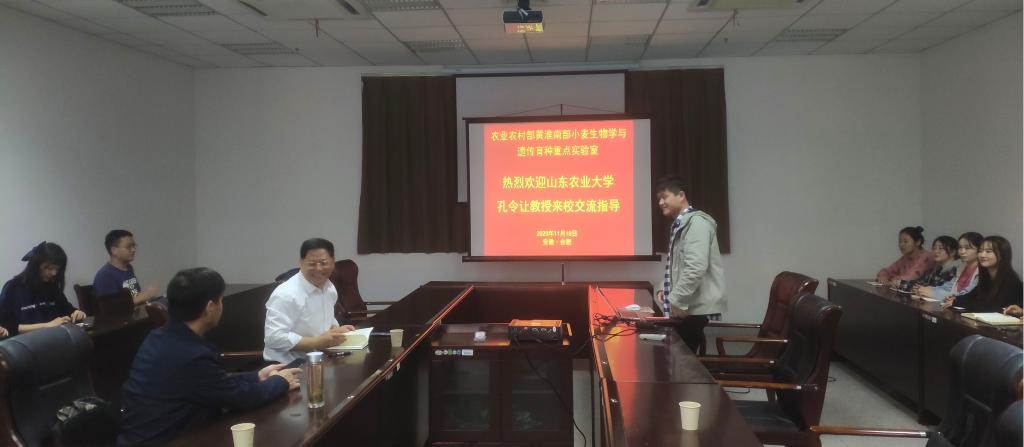 本网讯 11月18日下午,农学院、农业农村部黄淮南部小麦生物学与遗传育种重点实验室邀请山东农业大学农学院院长孔令让教授在生物科技楼423会议室开展学术研讨和交流,会议由常务副校长马传喜教授主持,农学院常成教授、张海萍教授、卢杰老师等参加了交流会。