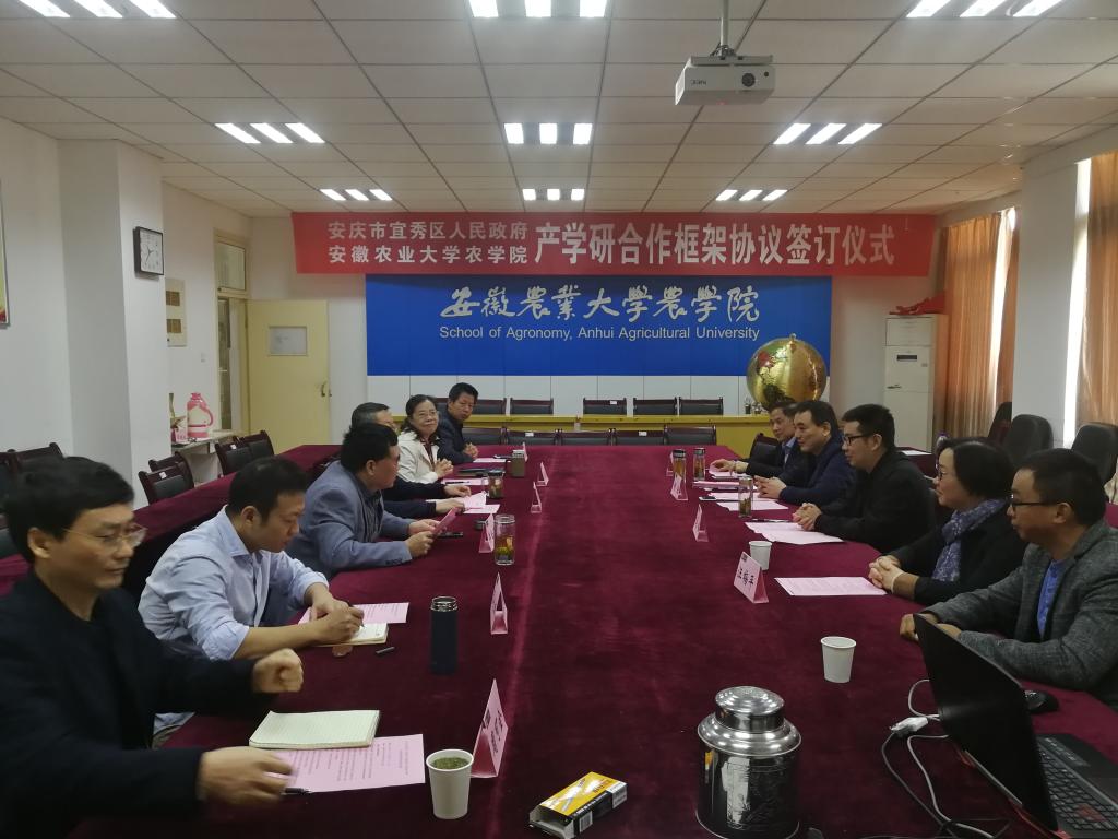 本网讯 11月9日上午,安庆市宜秀区人民政府与安徽农业大学农学院产学研合作框架协议签约仪式在农学院十教518会议室举行。宜秀区人民政府副区长马韬、区农业农村局副局长胡浩、区种植业管理中心主任马光荣、宇顺高科种业股份有限公司董事长汪梅平,农学院党委书记管志权、正处级组织员汪凤莲、院长李金才、党委副书记副院长吕大鹏、周可金教授、朱宗河副教授等出席了签约仪式。