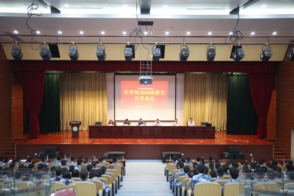本网讯 9月16日下午,农学院2020级新生开学典礼暨入学教育在图书馆一号报告厅隆重举行,学院党委书记管志权,院长李金才,党委副书记、副院长鄢高翔,副院长常成,各系部主任,办公室人员以及2020级本科生、研究生参加本次典礼。大会由鄢高翔主持。