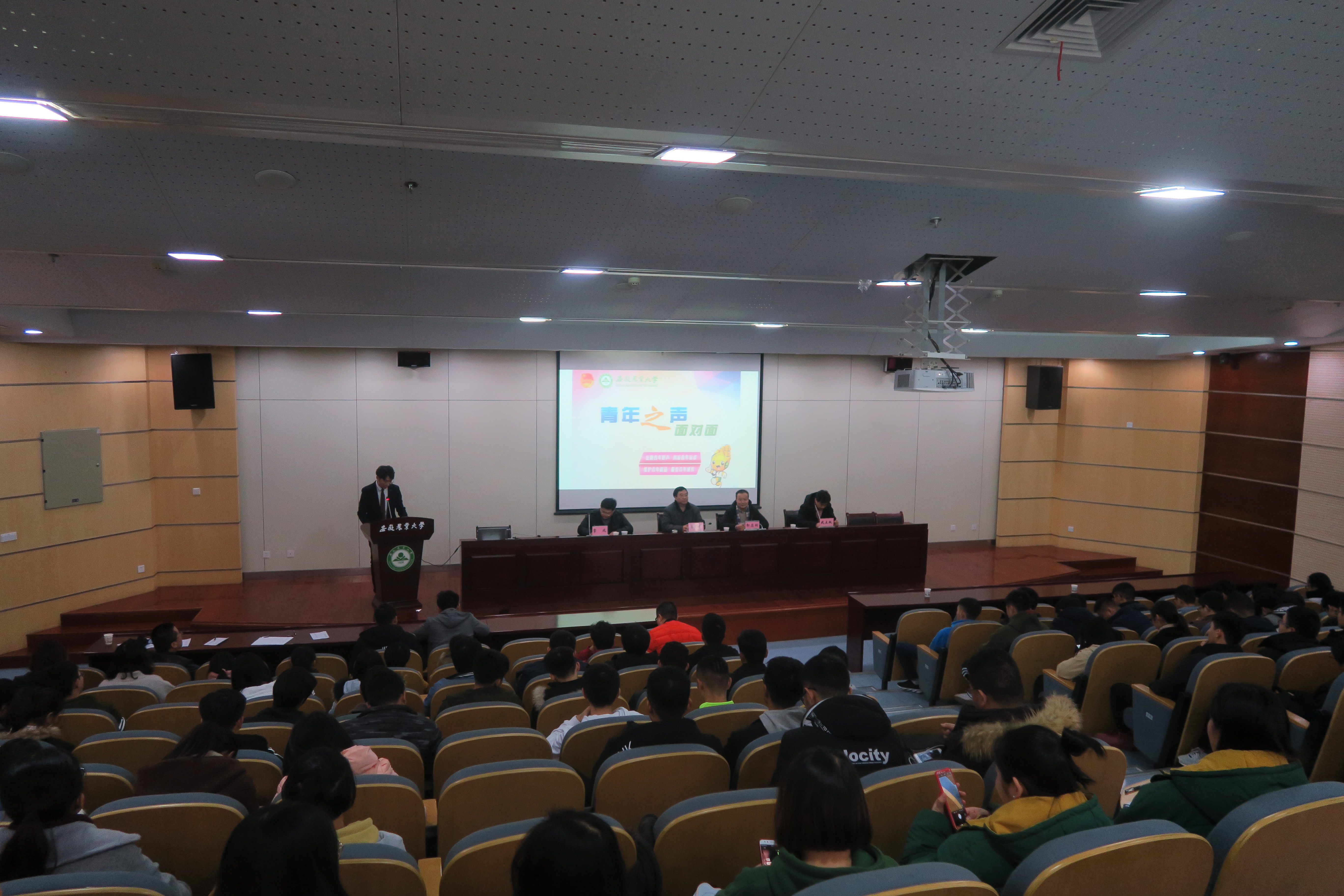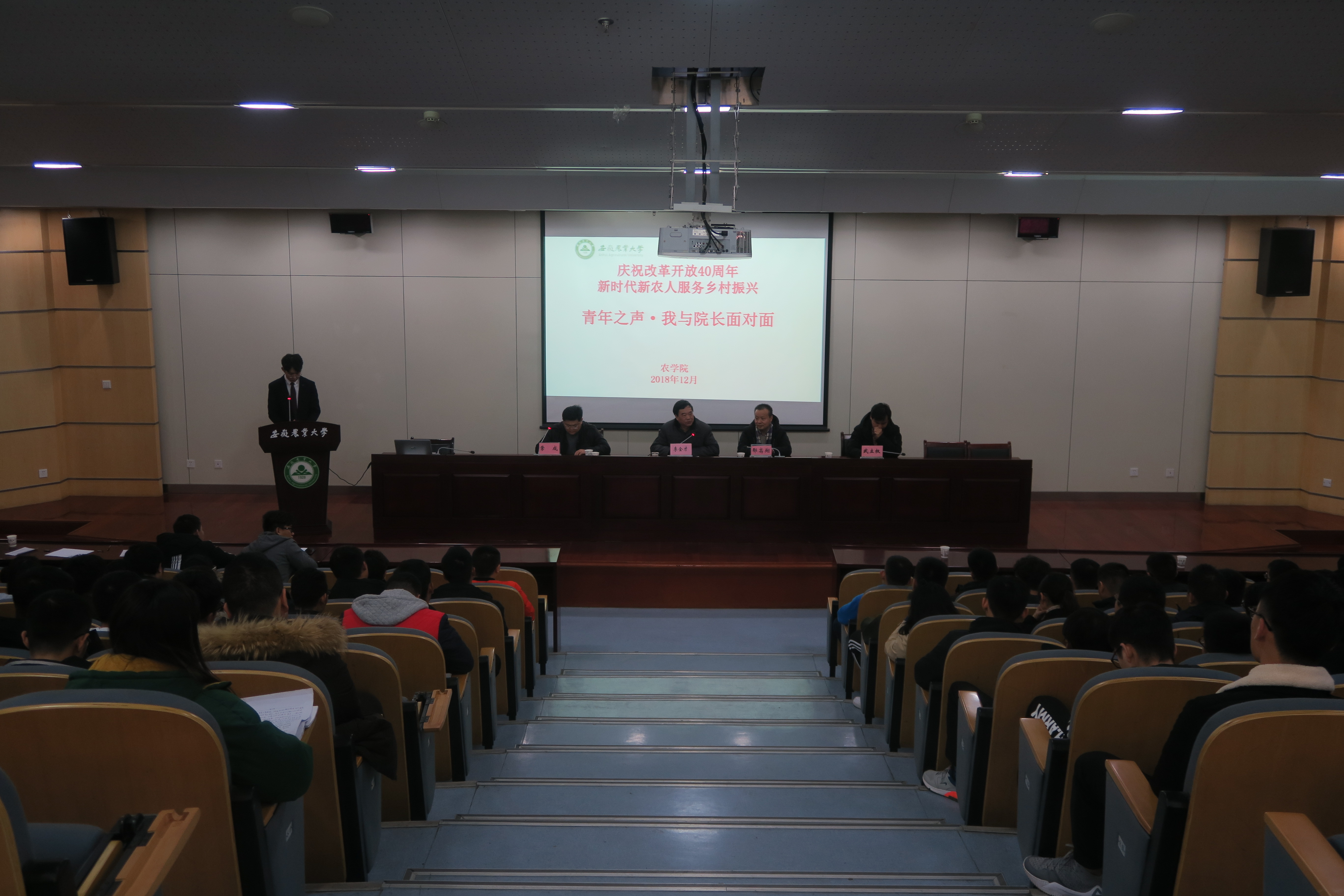 本网讯:12月18日晚七点,农学院“青年之声 ﹒我与院长面对面”在图书馆第二报告厅举行。本场面对面交流活动以“庆祝改革开放40周年,新时代新农人服务乡村振兴”为主题,院长李金才,党委副书记、副院长鄢高翔,副院长常成、副院长武立权参加活动并为同学们答疑解惑。各专业年级辅导员,2016级全体专业、2018级种子科学与工程专升本同学参加了交流会。