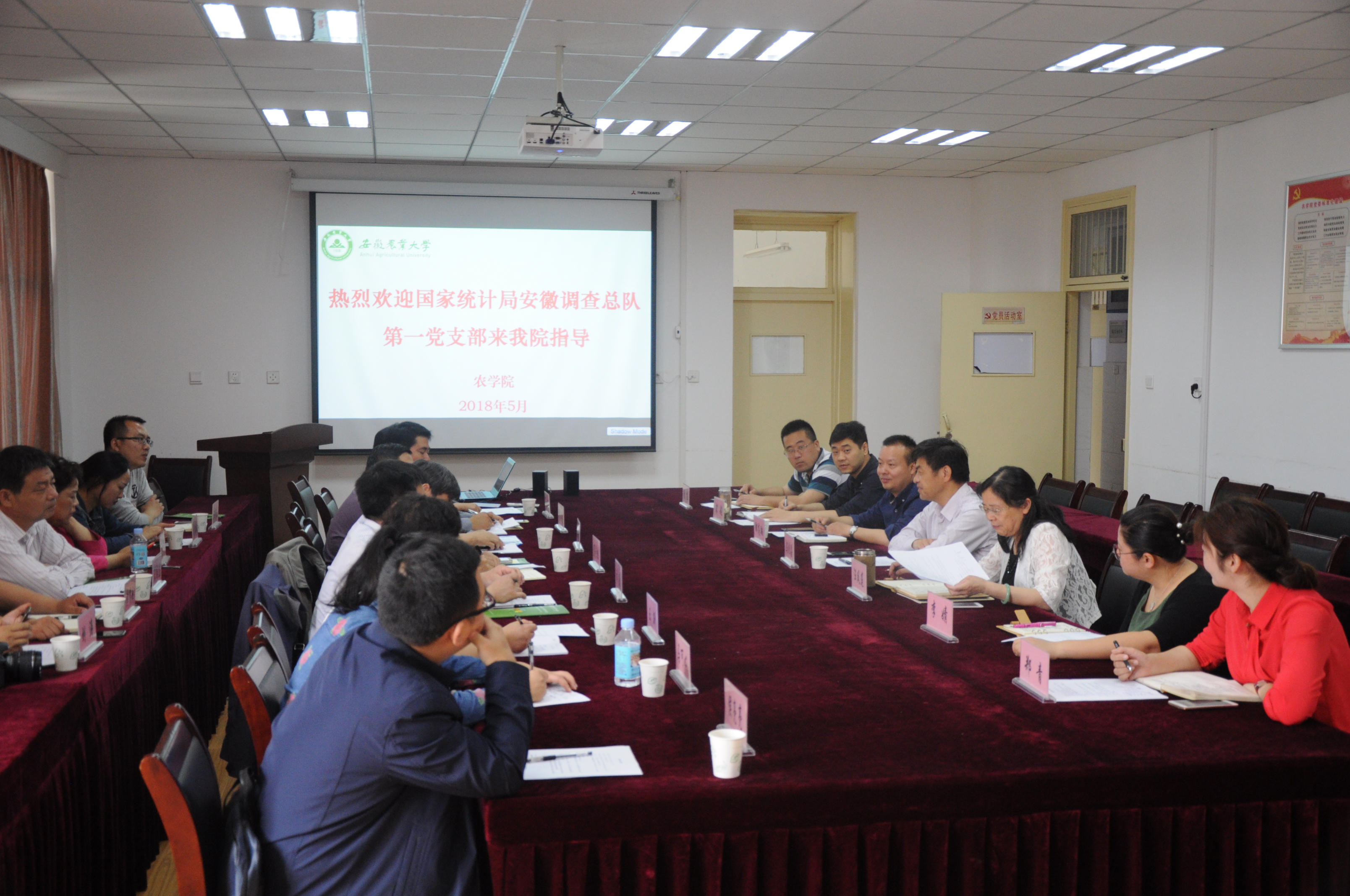 2018年5月11日,国家统计局安徽调查总队第一党支部以党支部为单位,来我校考察大学生创新创业情况,座谈交流现代青年农场主人才培养和创业孵化情况以及党建工作,并深入大学生创业基地开展调研,了解政、校、企联合培养农业复合应用型人才的新模式。
