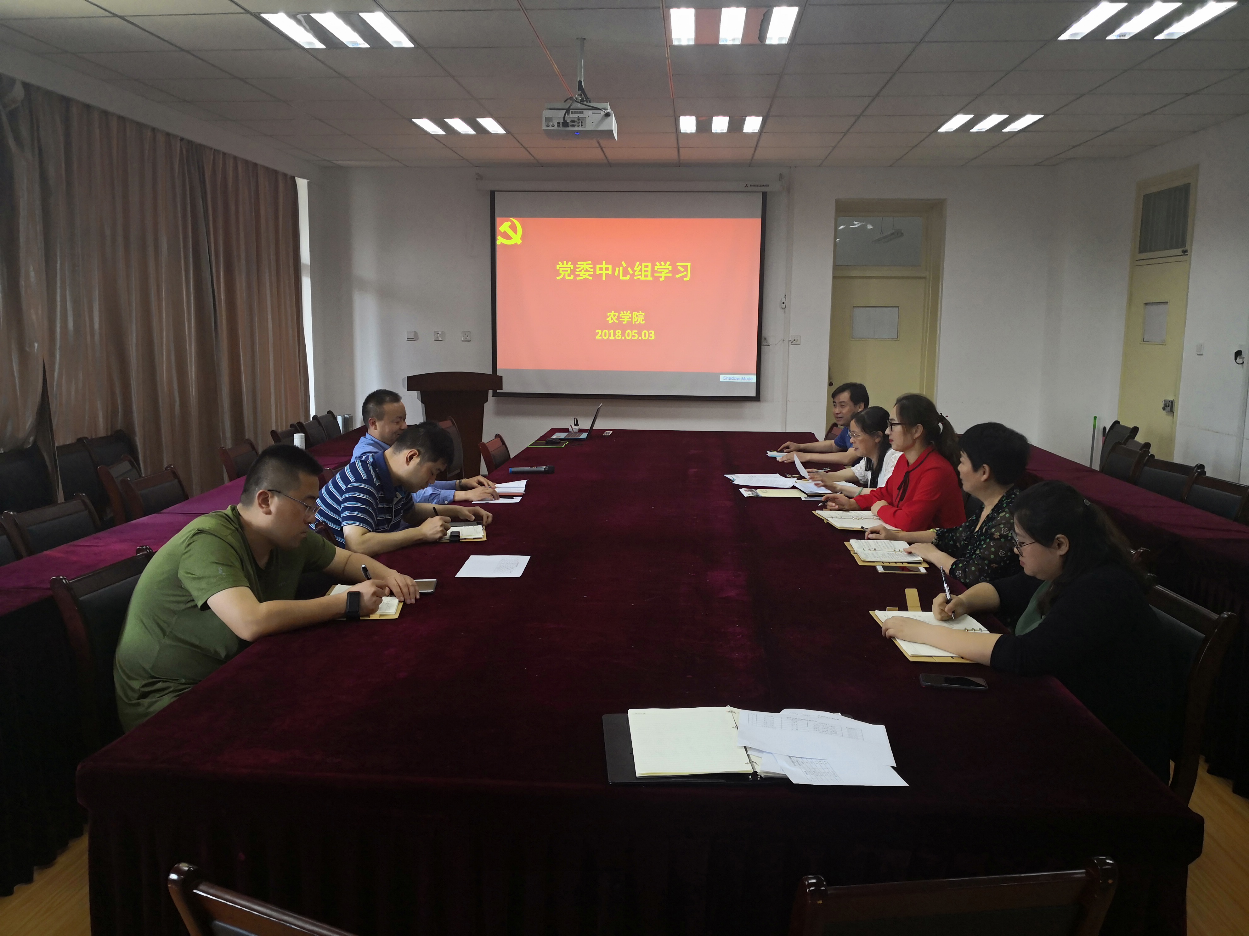 本网讯 2018年5月3日下午,农学院党委召开中心组学习讨论会,学习讨论习近平总书记在北大师生座谈会的讲话精神,会议由党委书记汪凤莲主持,学院党委委员、支部书记参加本次学习讨论。