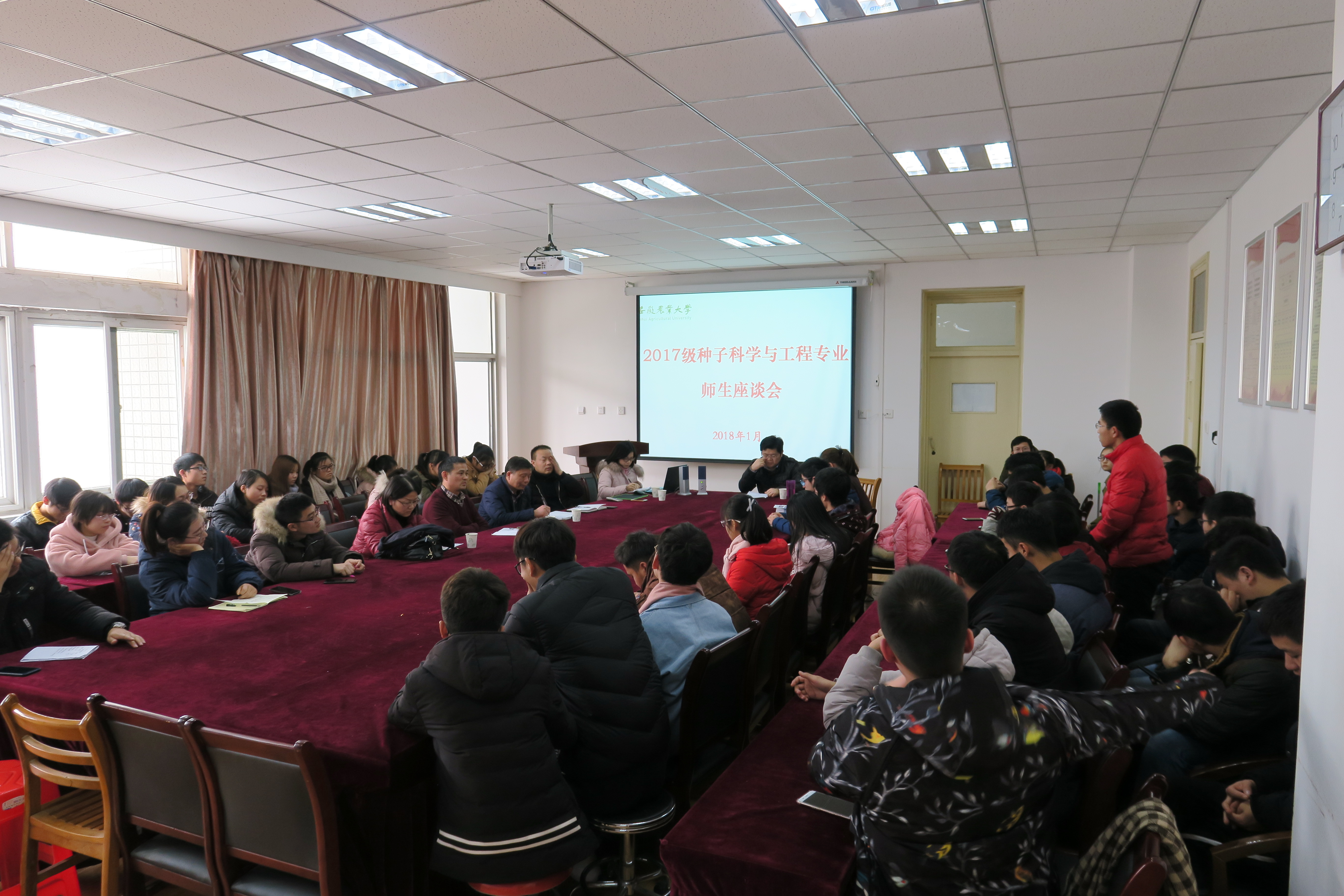 本网讯 2018年1月5日下午,校园里白雪皑皑,而十教518会议室内却是暖意融融,这里正举行着种子科学与工程系期末师生座谈会。农学院党委副书记、副院长鄢高翔、副院长常成,种子系全体教师、17级种子专业全体学生和15级学生代表陆少奇、刘家欣参加了座谈会,系主任郑文寅主持会议。