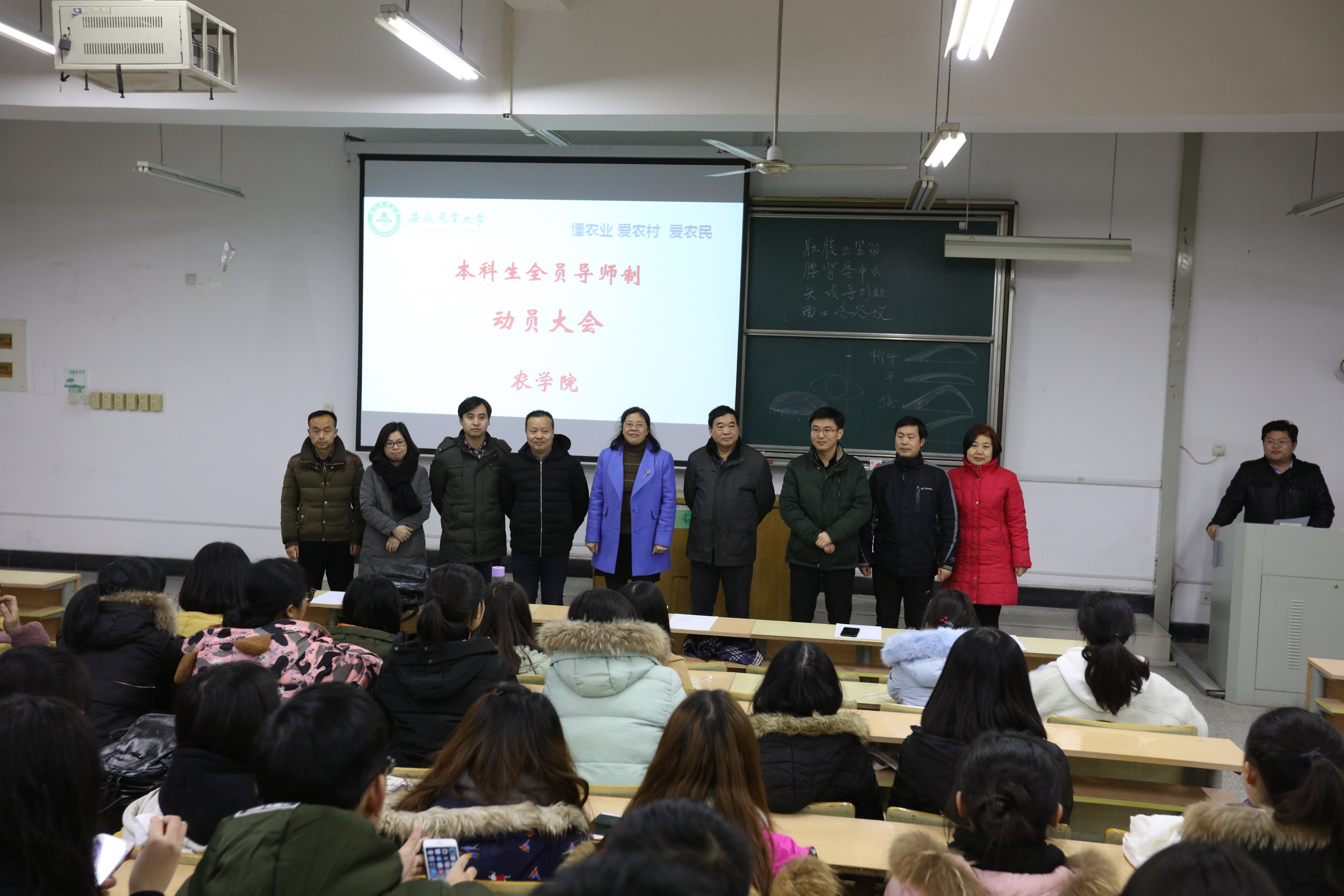 1月3日晚七点,农学院在九教227教室召开本科生全员导师制动员大会,党委书记汪凤莲、院长李金才、党委副书记鄢高翔、副院长常成、副院长武立权,各系主任、专业负责人、专职辅导员以及2017级本科生200名余同学参加动员大会。会议由副院长常成主持。