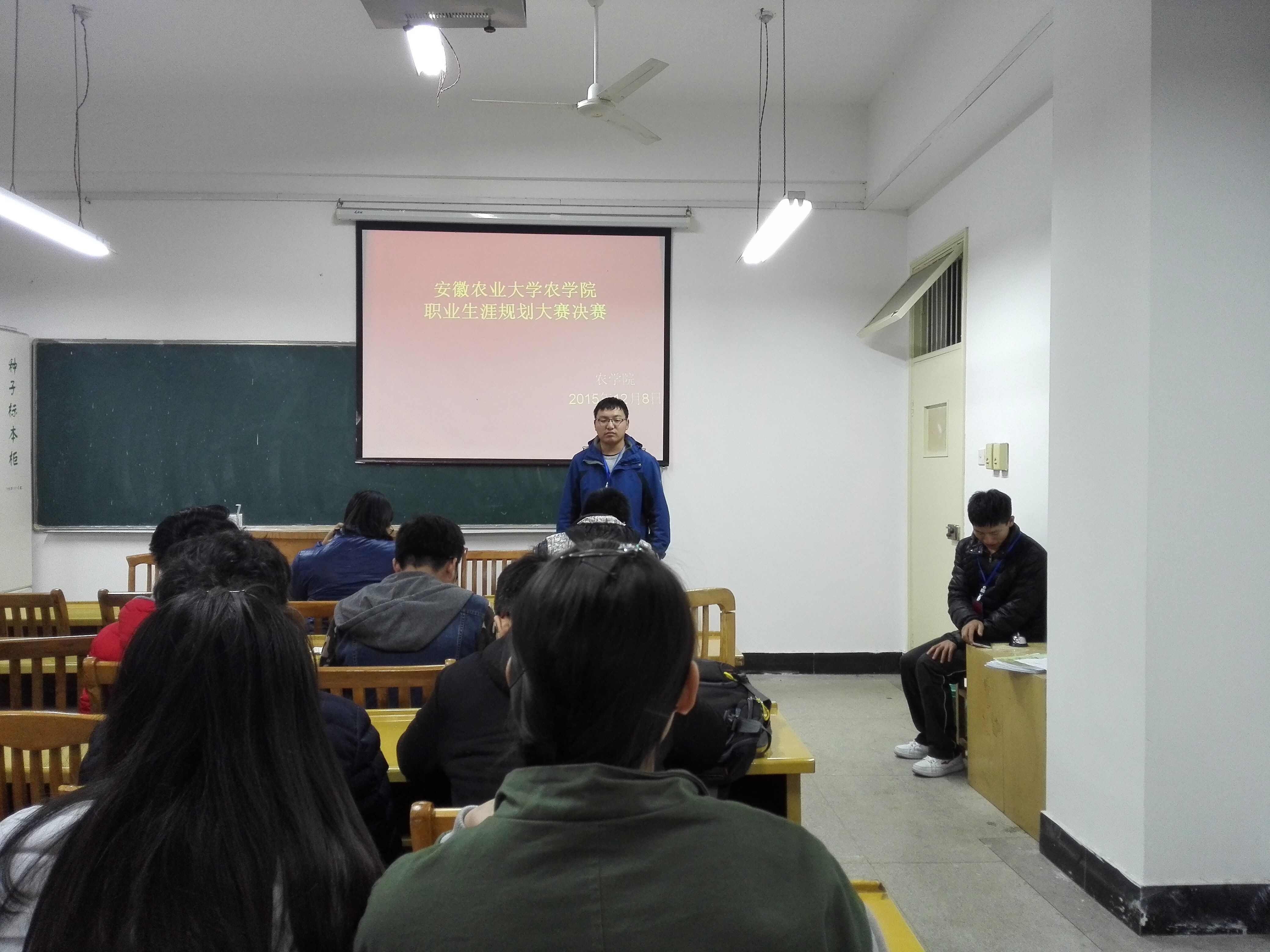 为满足当代农学学子面对激烈的职场竞争和日益高涨的自我发展需求,在大学期间规划自己的职业生涯,明确未来的职业发展方向,并结合自己的职业生涯规划,有计划、有目的地学习和生活。农学院大学生职业生涯规划大赛决赛于2015年12月8日晚在十教522正式拉开帷幕。农学院党委副书记鄢高翔老师、农学院办公室副主任李婧老师、农学院团委书记仇飞老师也莅临现场担任本次比赛的评委,对参赛选手的表现进行评分,并给予专业的建议。