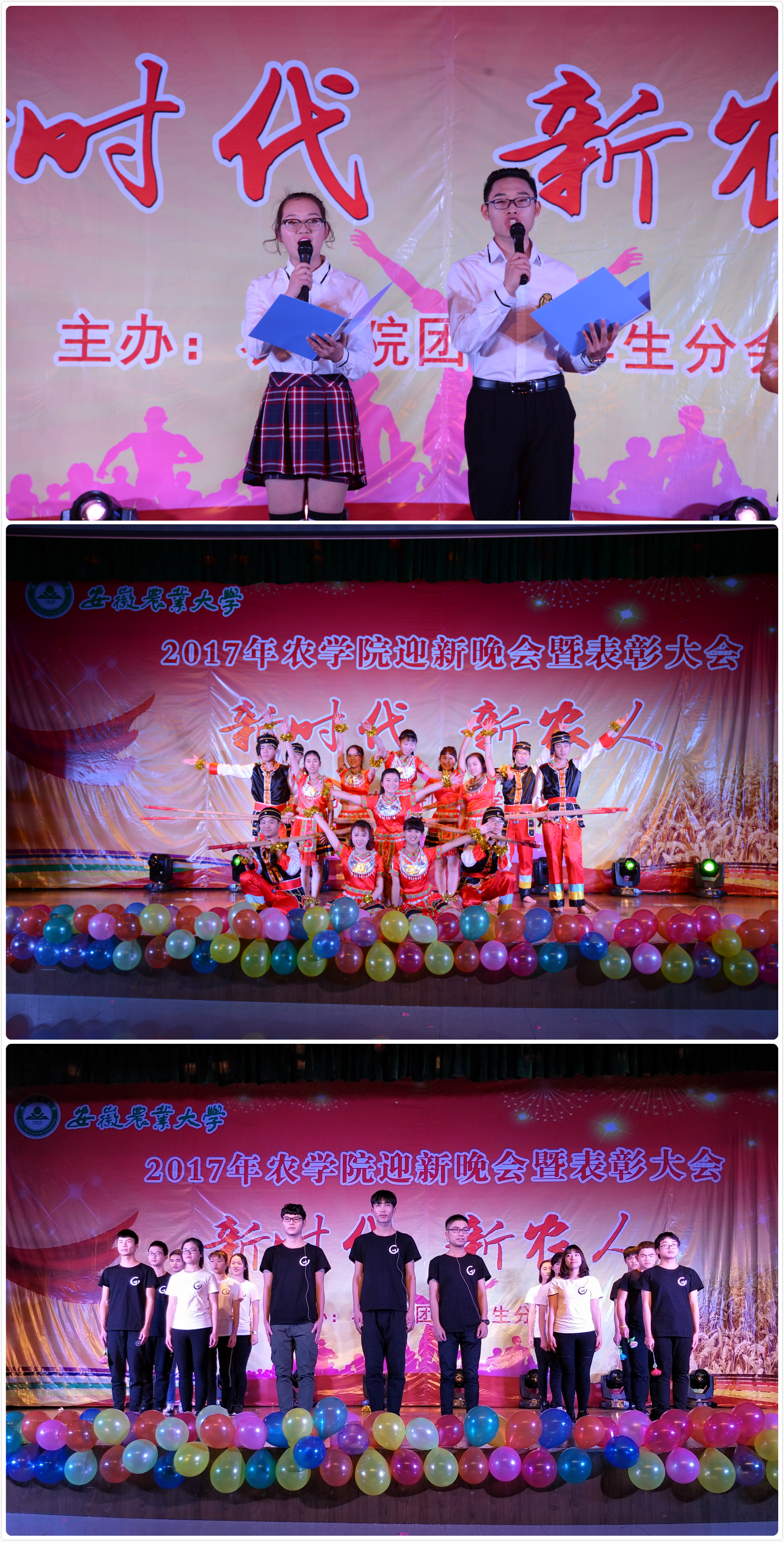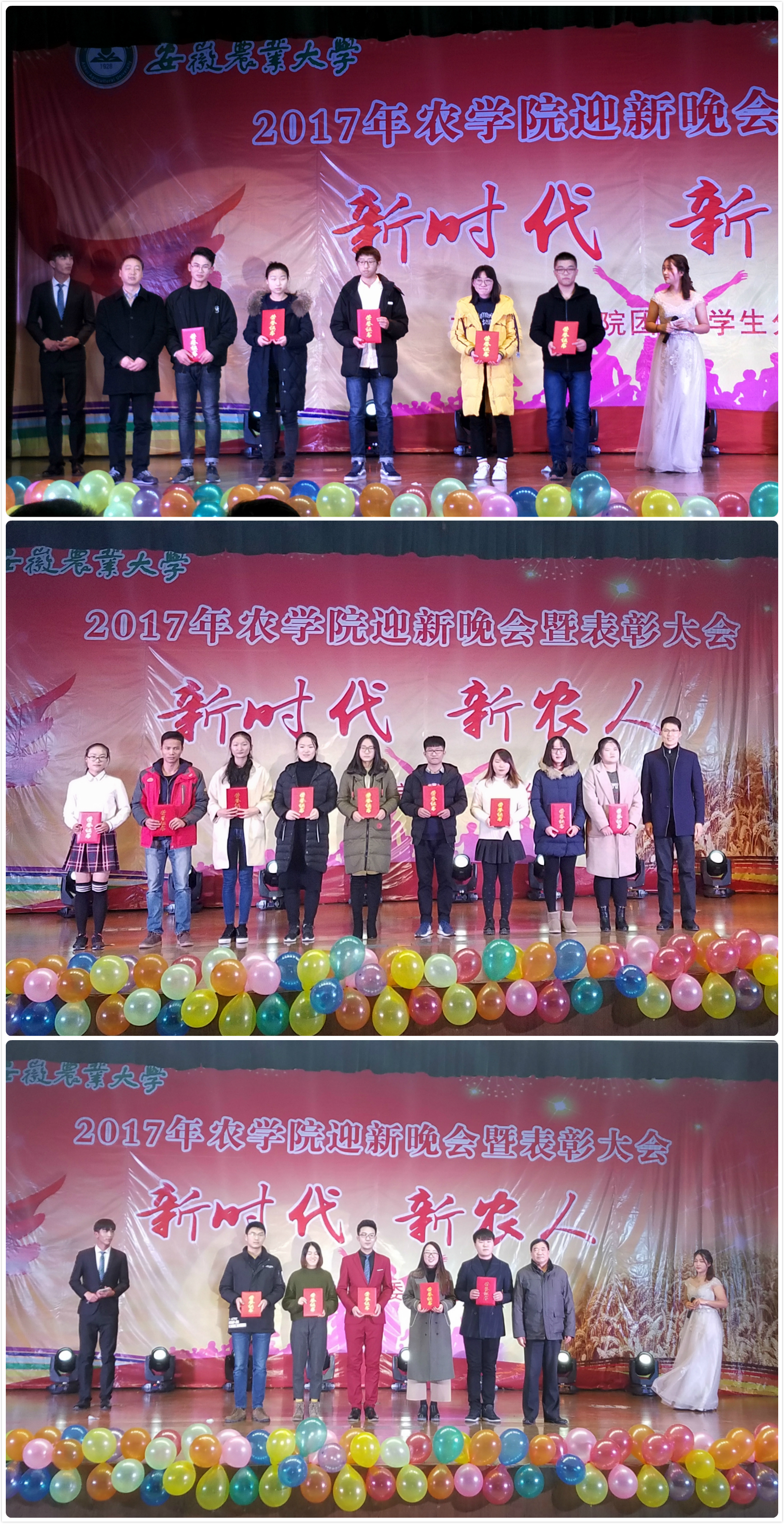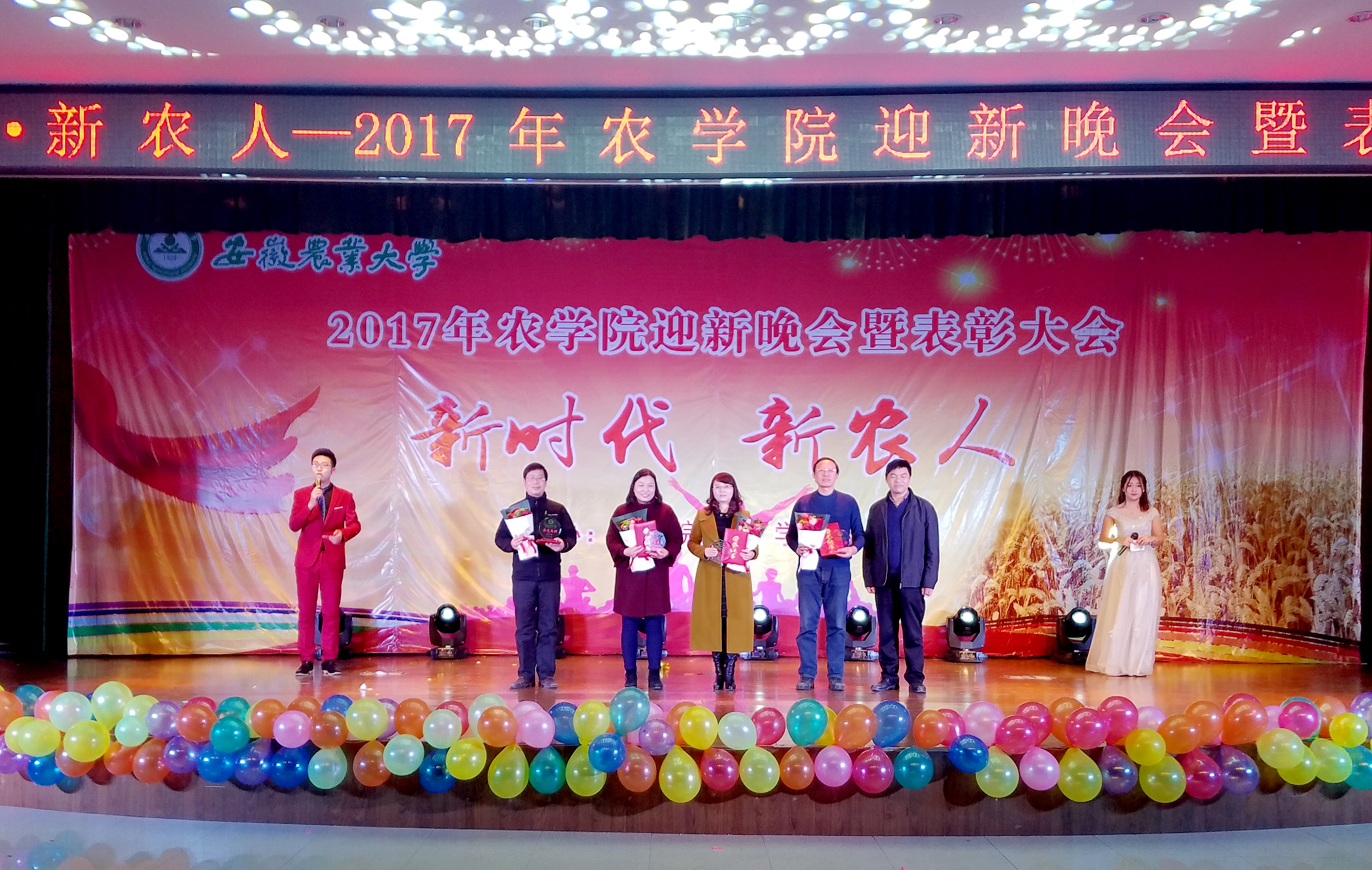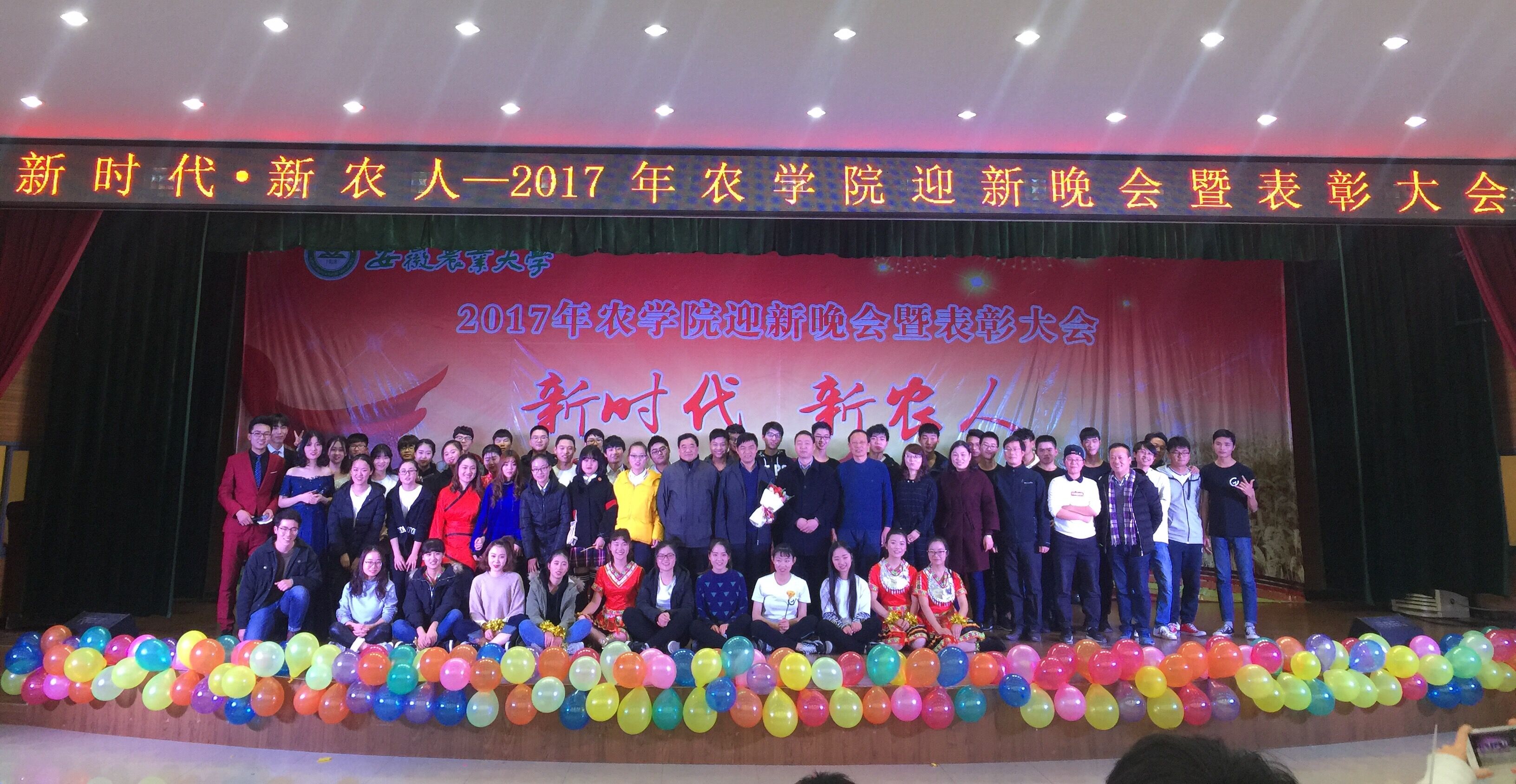本网讯:12月26日晚,农学院“新时代 新农人”2017年迎新晚会暨表彰大会在欣苑四楼学生活动中心盛大开幕。副校长马传喜、学生处处长彭庆刚、校团委书记张健、学院院长李金才、党委副书记鄢高翔、副院长武立权,与农学院师生共计500余人欢聚一堂,共同欣赏了这场缤彩纷呈的视听盛宴。