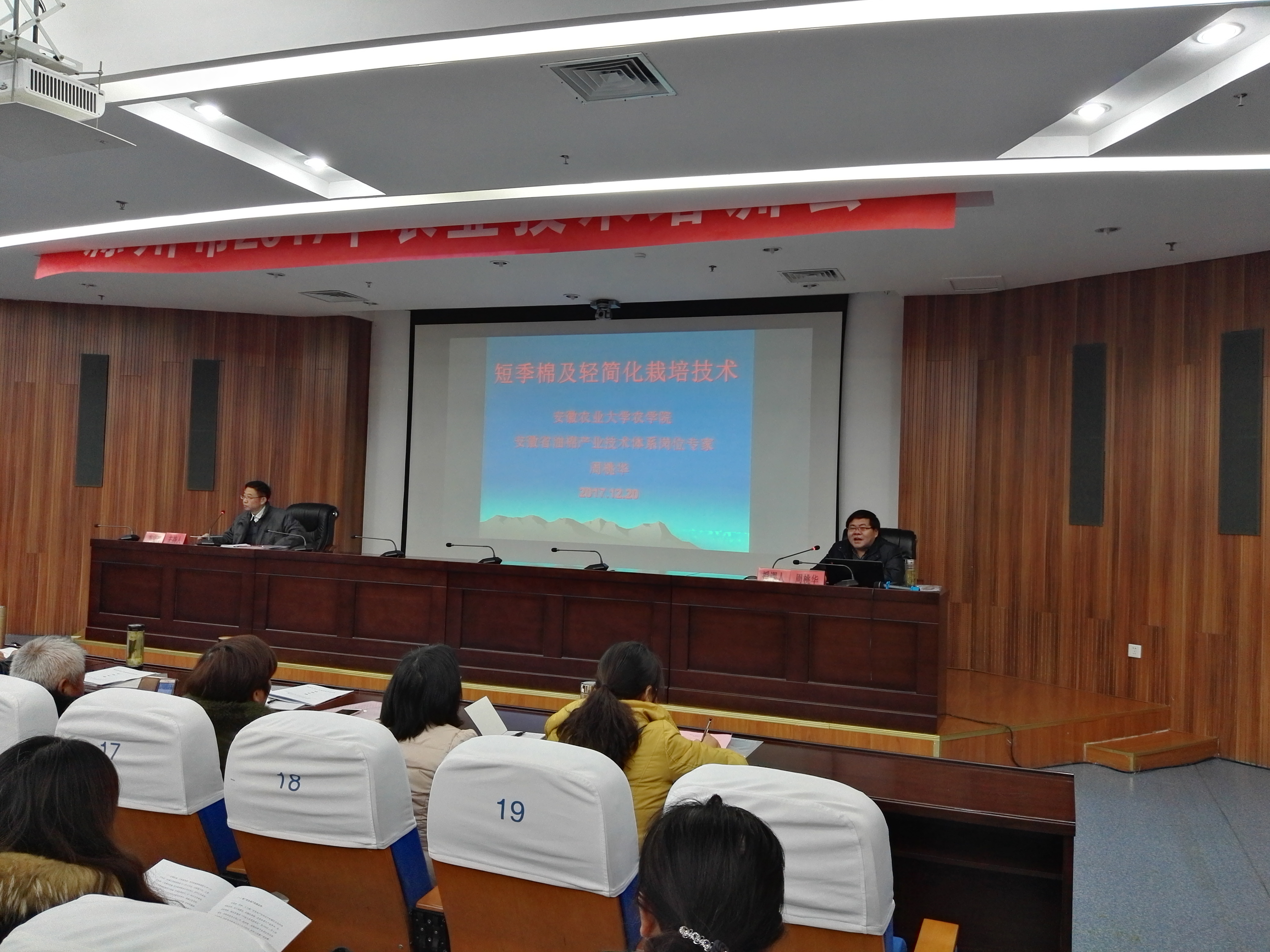 受滁州市农委的邀请,安徽农业大学农学院副院长武立权教授、朱宗河副教授、周桃华副教授在培训会上,分别作了《水稻规模化经营和轻简化生产》、《新形势下稻茬油菜绿色高产高效栽培技术》和《短季棉及轻简化栽培技术》为主题的技术讲座,专家们结合十九大学习精神、乡村振兴战略、农业政策宣传,理论联系实际、深入浅出、图文并茂的培训,得到了基层农技人员和种植大户的一致好评。(通讯员:彭琼琼)
