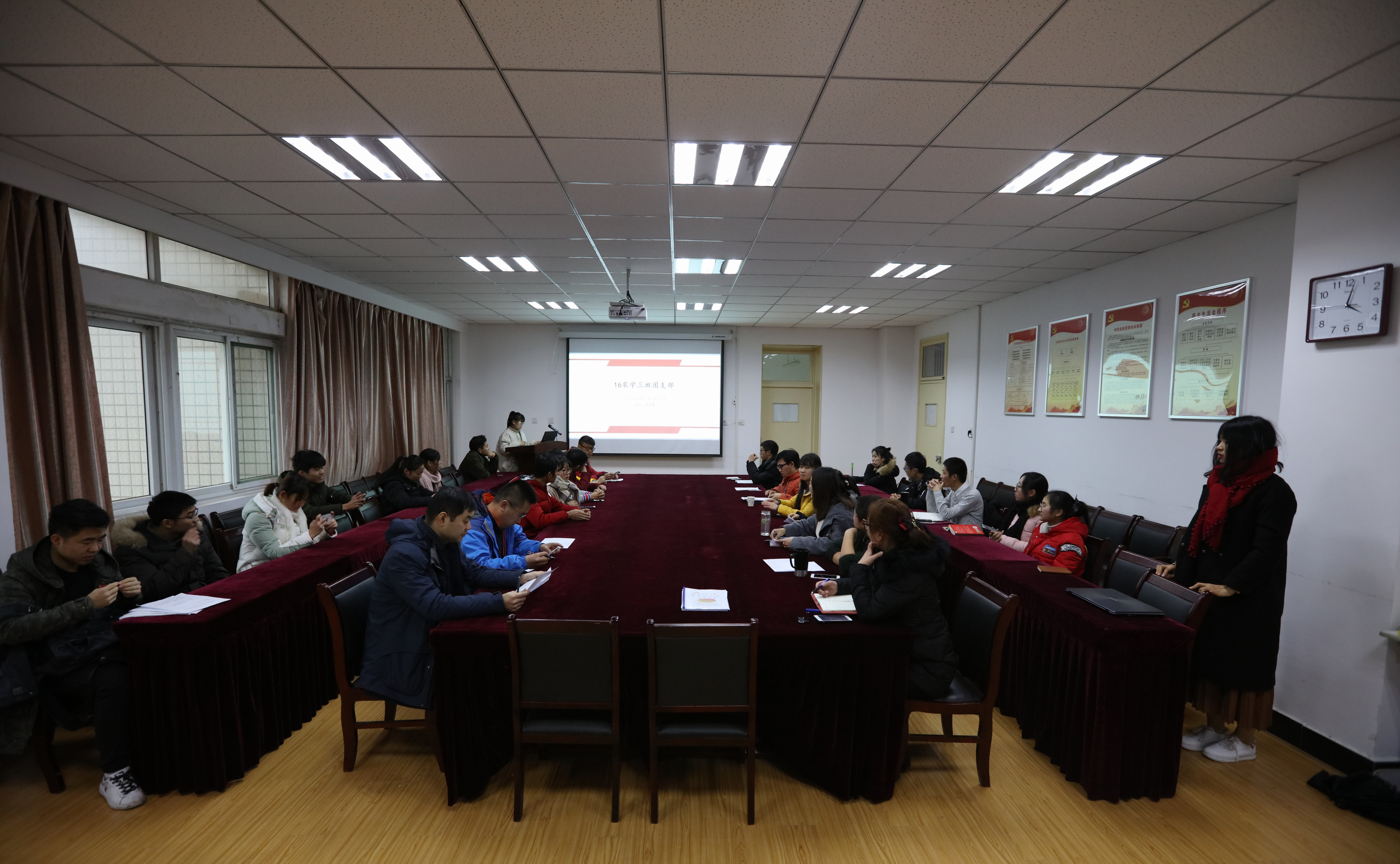 本网讯 12月14日下午, 农学院在十教537会议室举行了2017年度“先进团支部”答辩会。学院办公室主任宋超、副主任李婧、团委书记仇飞、办公室彭琼琼、郑青出席并担任评委,2015级-2017级团支部参加本次“先进团支部”评选答辩。