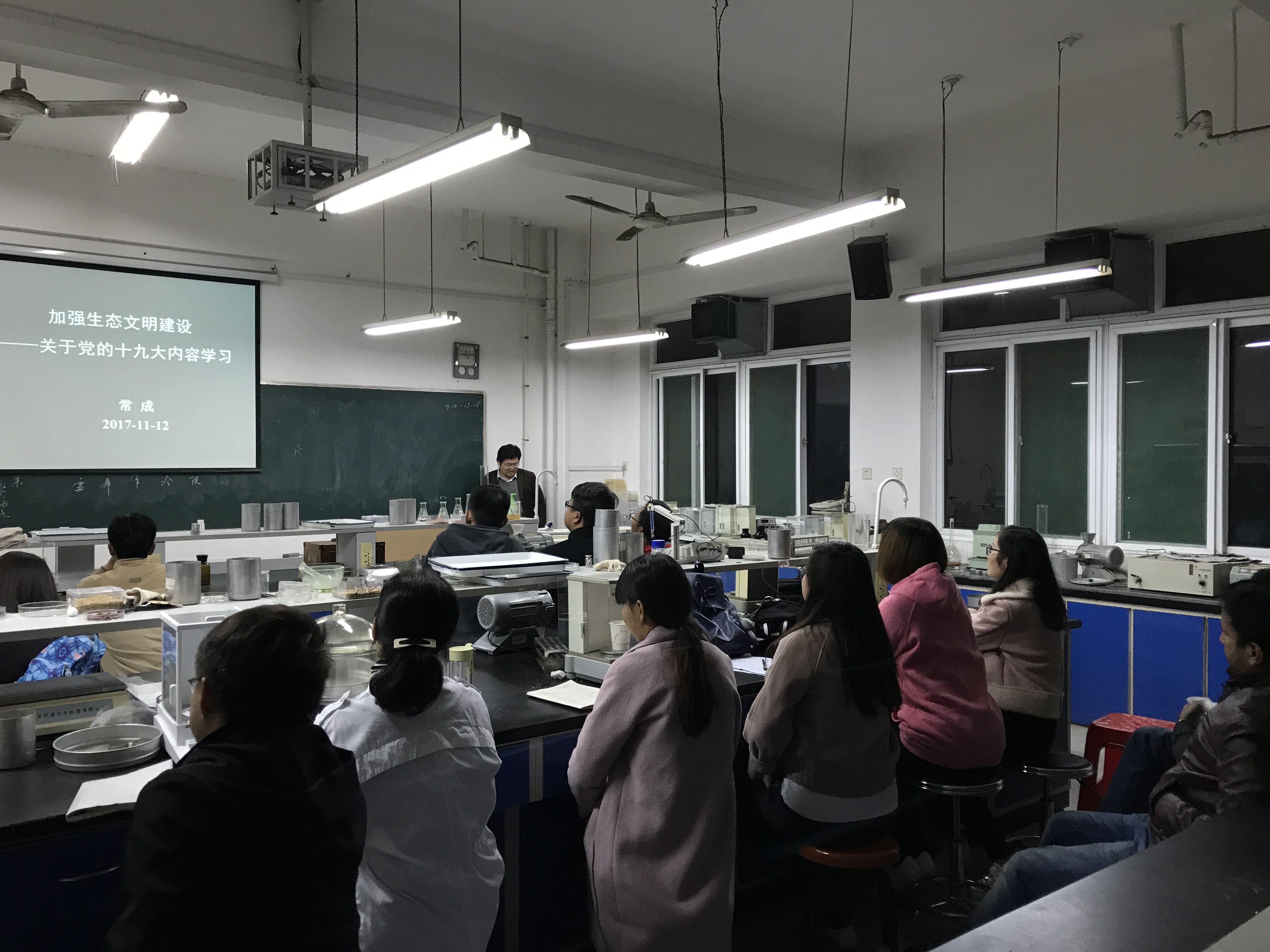 11月12日晚,农学院副院长常成带领17级作物学研究生学习了党的十九大报告中“加强生态文明建设”等重要内容。结合研究生专业实际,主要探讨了生态文明建设的重要性和战略性、加强生态文明建设仍然在“路上”、新阶段如何进一步加强生态文明建设等内容。通过这次学习,同学们了解了生态文明建设在农业现代化中的重要意义,以及所学专业与生态文明建设的关系,为以后科研方向提供重要参考。此次学习,同学们深化了生态文明建设的理解,取得较好的学习效果。