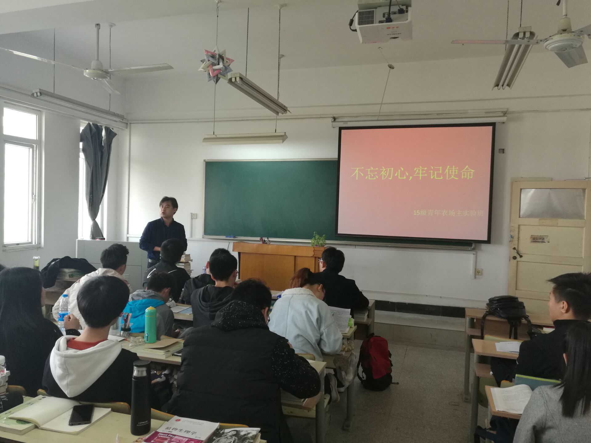 11月13日上午,农学院副院长武立权为15级青年农场主试验班同学开展了主题为“不忘初心、牢记使命”的思政课。武院长说学习贯彻落实党的十九大精神,就是要深刻领会、准确把握报告的精神实质与核心要义,不断提高思想认识和理论境界,把思想和行动统一到党的十九大精神上来,不忘初心、牢记使命,继续前进。希望15级青年农场主班同学要主动自觉深入地学习党的十九大精神,要紧跟时代潮流,结合所学专业,加快农业现代化,为中国农业发展贡献自己的力量。(通讯员:彭琼琼)