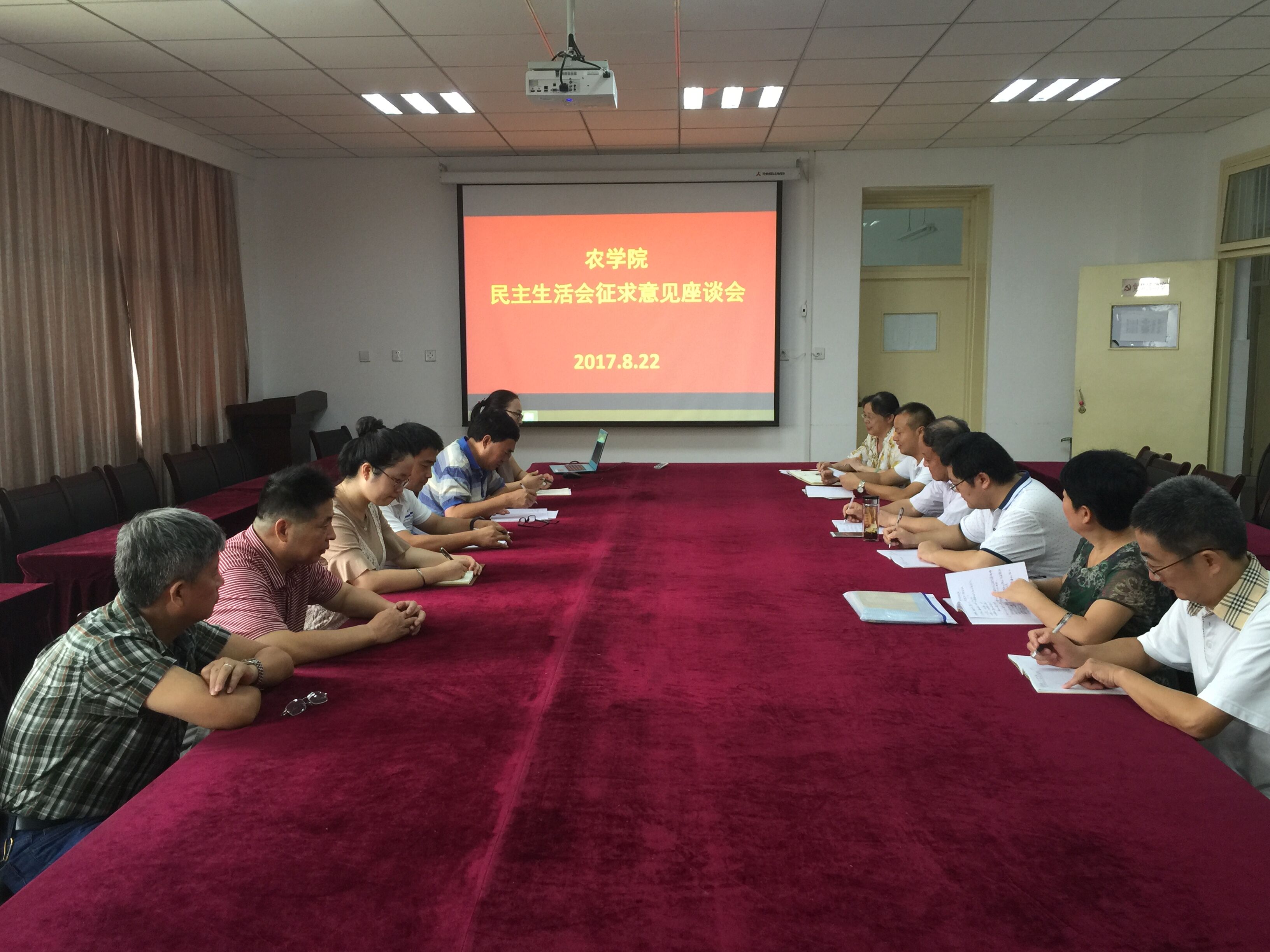 本网讯 为深入推进“讲政治、重规矩、作表率”专题警示教育扎实开展, 切实开好农学院领导班子专题民主生活会,8月22日下午,农学院在十教518召开征求意见座谈会,广泛听取支部书记、系主任、学科带头人、无党派代表、教师代表对学院、班子成员的意见建议。