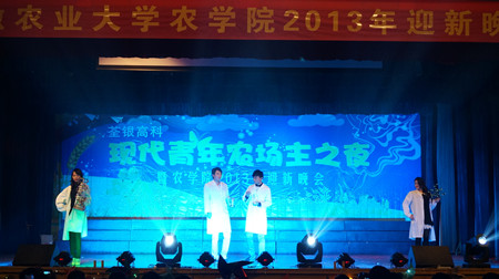 农学院2013年迎新晚会,农学学子通过自导自演秀出别样风采;这里,是属于农学学子们独一无二的梦想农场。晚会现场全院同学们通过微博互动,纷纷表达对学院、专业的热爱和自己的梦想。通过迎新晚会,不仅为同学们提供了一个展示自我平台的机会,更让同学们感受到了作为一名农学专业的学生的责任感和使命感。(通讯员:吕莎莎)