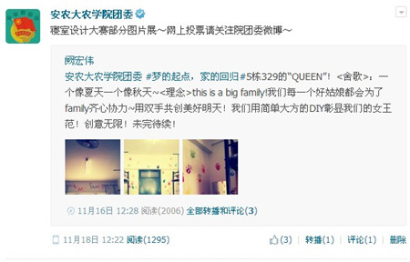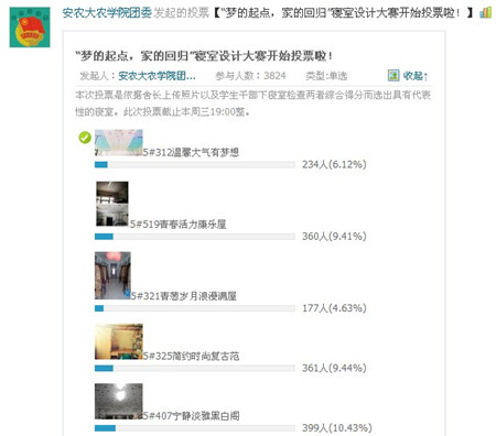 在评比环节,本次大赛充分发挥了农学院新媒体力量,打破传统的单一下寝室检查模式,突破创新,通过腾讯微博线上展示、报名,网络投票与现场打分相结合的方式,让全院同学充分参与进来,评出自己心目中的最美寝室;同时后期还通过线上的微博、微信及线下常规宣传模式举办优秀寝室照片展,向同学们展示了各具特色的优秀寝室。