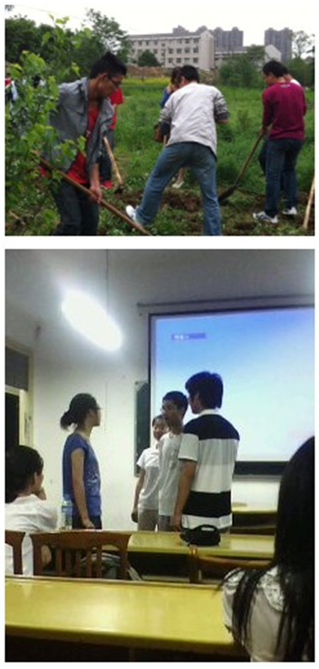 可是活动的开展却没有班委们想像的那么顺利,原本以为同学们会很感兴趣,却不曾料到参加此活动人数寥寥无几,每次下地干活的只有几个班委。于是,班委们一边带头工作,一边努力跟同学们交流,做思想工作。班长把他们在百草园里工作时的快乐瞬间也拍了下来,分享到自己的空间吸引同学们参加进来。没过多久,全班同学便积极的参与进去了。班级人员都参加了,班长和团支书马上就安排好人员,分工合作。男生们去翻土,整理地形以及施肥,女生们便播种浇水。