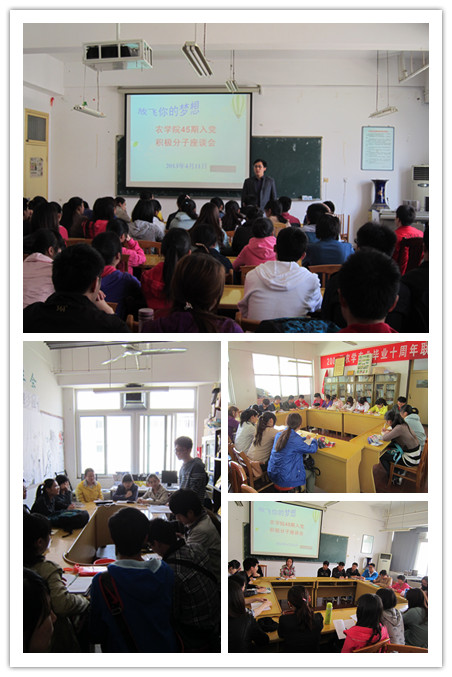 本网讯 为引导广大学生为实现国家富强、民族振兴、人民幸福的伟大“中国梦”而努力学习、不懈奋斗,4月11日中午,农学院在多媒体教室召开了入党积极分子座谈会,全院第45期入党积极分子培训班学员参加会议,会议由分党校班主任主持。