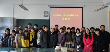 本网讯 12月18日下午2点,农学院在学院多媒体教室举办了农学院2012年先进团支部评选答辩会。农学院党委书记汪凤莲、院长姚大年、党委副书记姜家生和团委负责老师出席会议并担当评委。