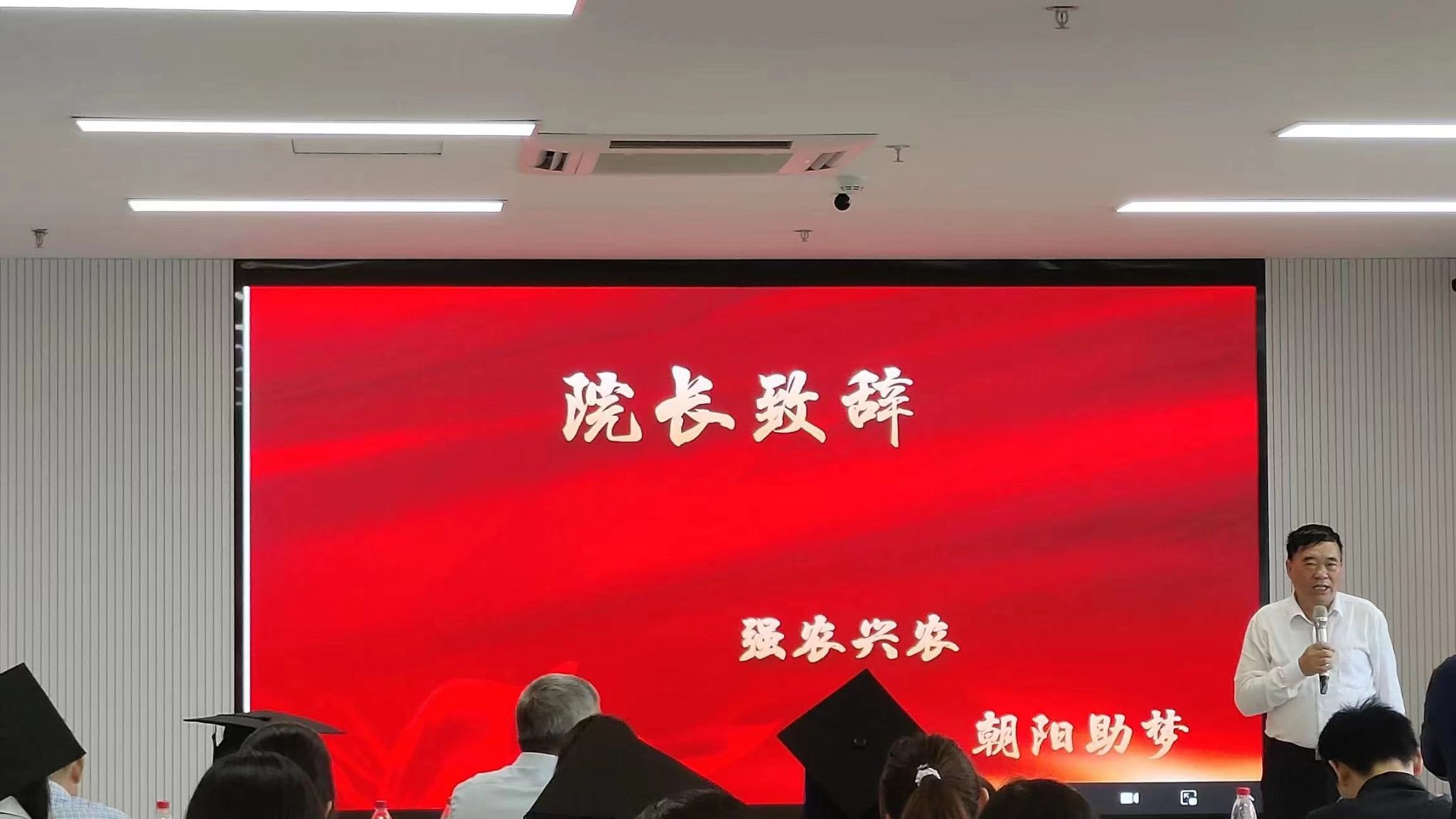 大会现场与季朝阳先生视频连线,同学们热情欢迎,现场氛围热烈。季朝阳结合自身的成长经历,为学生们送上了真挚温暖的祝福与殷切的寄语,鼓励同学们不忘知农爱农的初心,要胸怀大局,放眼世界,敢闯敢为,为中国农业的发展做出自己的贡献。