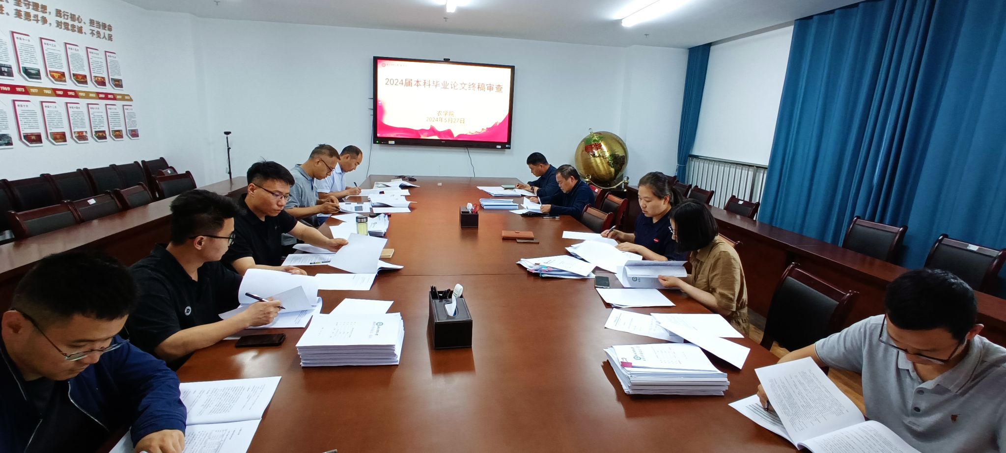 农学院本科生论文答辩于5月24日全部结束,针对论文不足之处,学院要求全体毕业生在答辩结束后对论文认真修改。5月27日下午,学院邀请督导组老师周桃华、农学系主任陈翔、马尚宇,作物育种与种子科学系主任黎珉,各专业老师李金鹏、葛文杨、吴巩、刘小双、姜昊等对全院203位同学论文进行再次审查。