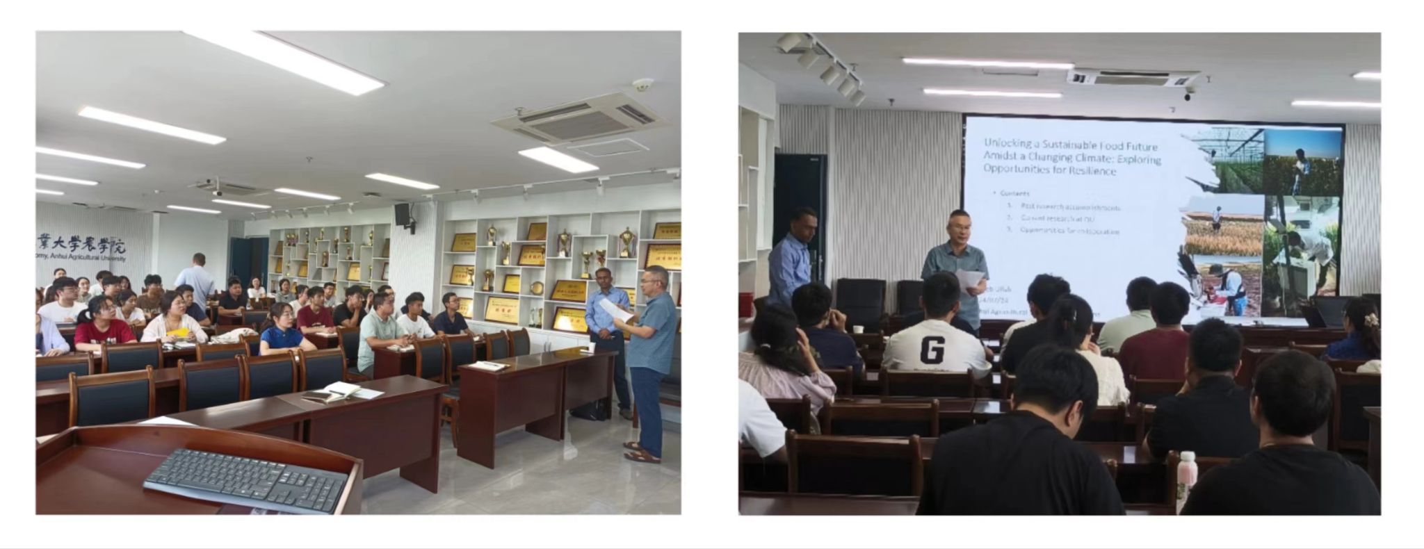 本网讯 卡塔尔大学Najeeb Ullah博士访问河南期间,受宋有洪与马尚宇老师邀请,于2024年7月24-26日期间访问安农大农学院,开展学术交流活动。Ullah博士为澳洲籍,曾在澳洲悉尼大学与昆士兰大学工作多年。24日上午9点,在朝阳楼204报告厅,Ullah博士做了‘Unlocking a Sustainable Food Future Amidst a Changing Climate’学术报告,余恩副院长与宋有洪老师主持了学术报告会,我院及外院师生踊跃参加。Ullah博士系统介绍了他在作物抗逆生理与智慧生产方面研究工作,与此同时,Ullah博士也希望促进建立更多中国与卡塔尔大学以及澳洲大学之间的交流合作,并介绍了多种合作渠道!