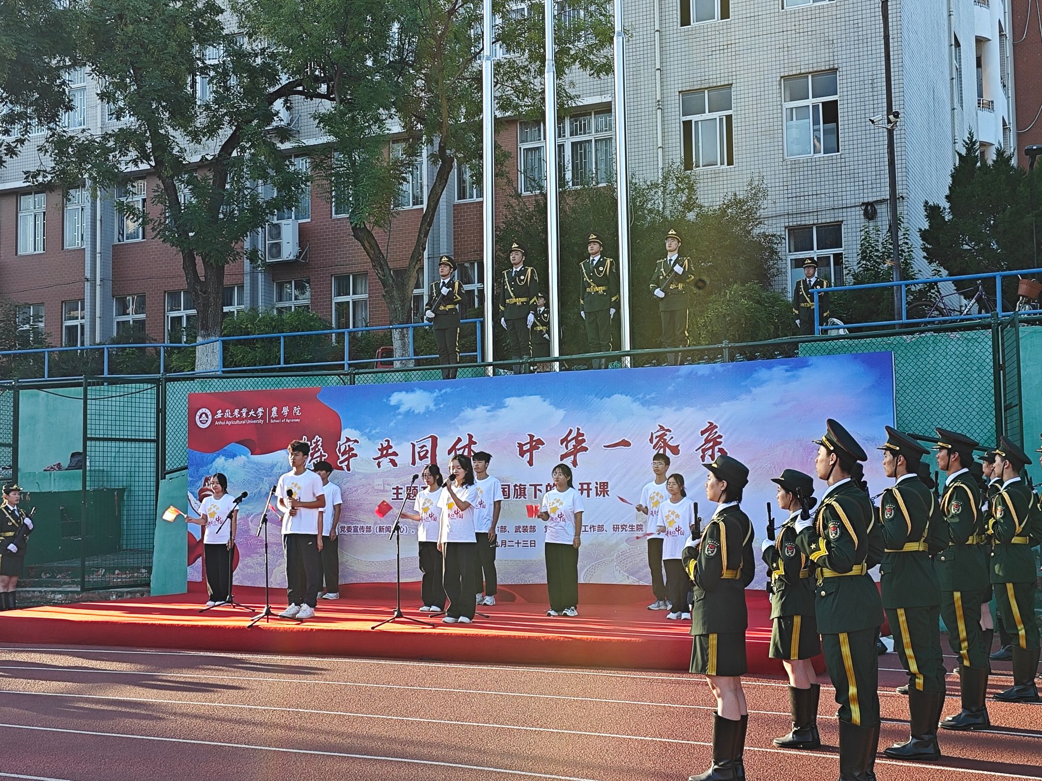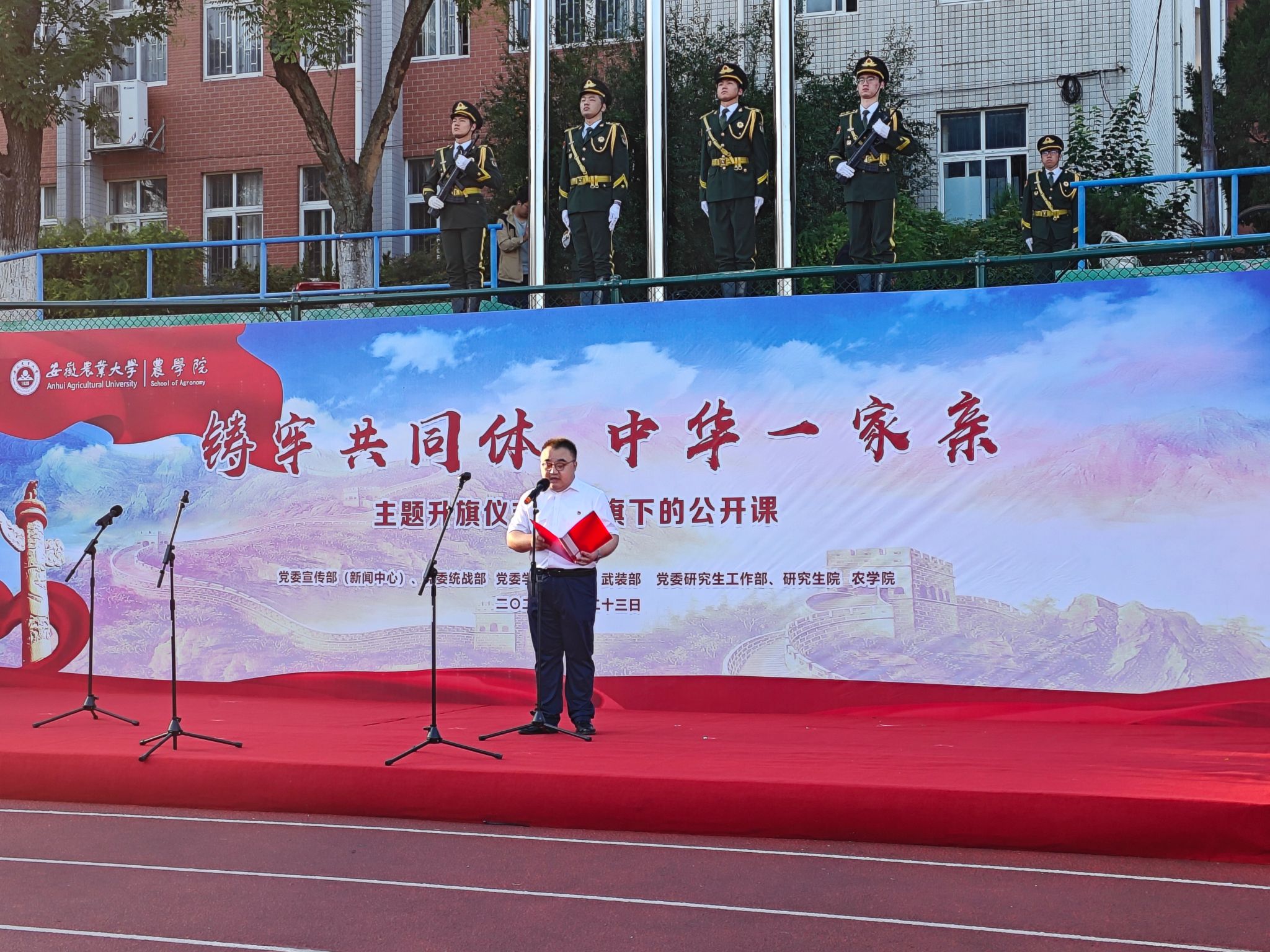 清晨七时整,升国旗仪式正式开始。国旗仪仗队身着戎装,昂首挺胸,迈着整齐划一、铿锵有力的步伐,护送五星红旗正步走向旗杆。全体师生面向国旗肃立致礼。随着军乐队奏响激昂的《义勇军进行曲》,师生们注视着五星红旗在熠熠晨光中迎风飘扬,齐声同唱中华人民共和国国歌。农学院学生代表以一首《少年》展现青年学子的朝气蓬勃。