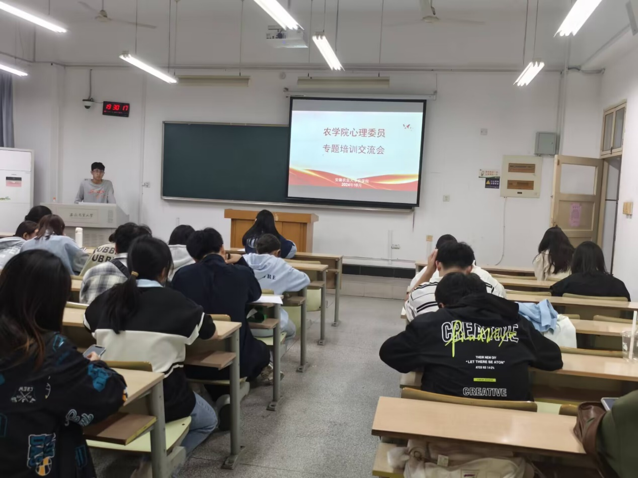 本网讯 为进一步推动学院心理健康教育工作走深走实,建设一支专业的学生心理骨干队伍。10月12日晚,农学院在博学楼104举办学生心理骨干专题培训会。院学生分会心理联合部、全体心理骨干参加了此次会议。会议由院心理工作联络人李静主持。