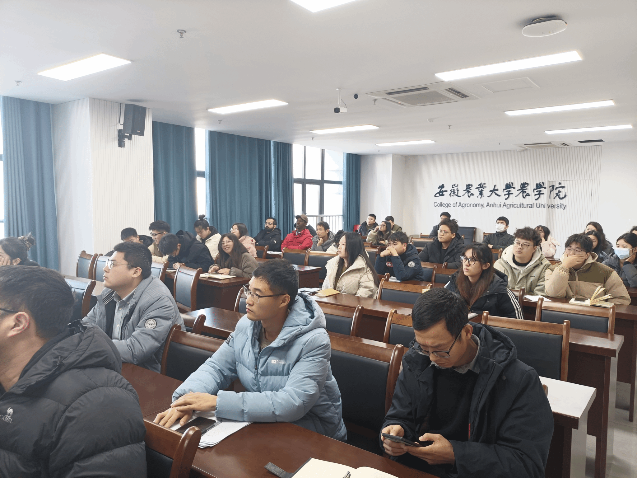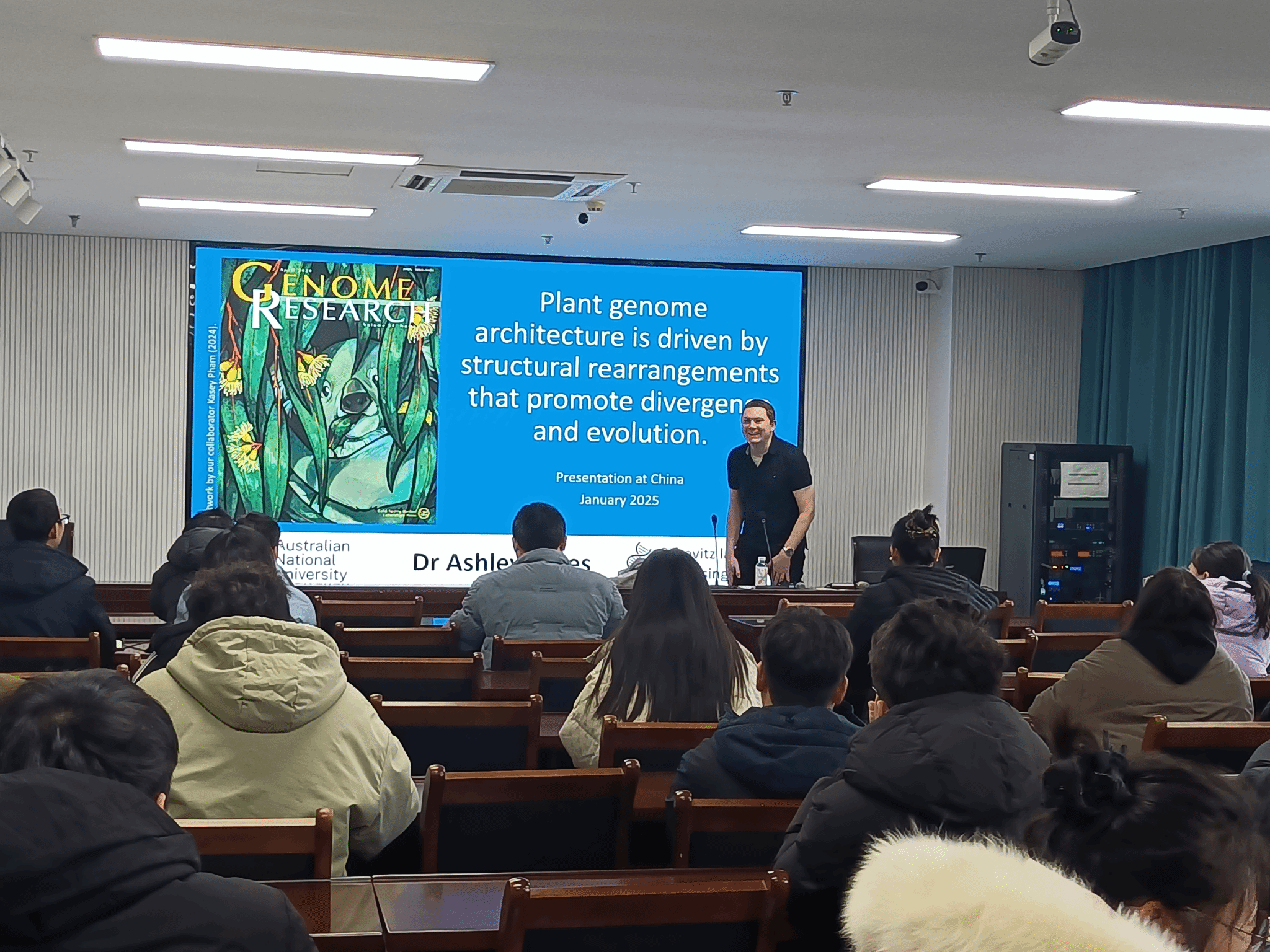 本网讯 1月13日,安徽农业大学农学院在朝阳楼202会议室举行“青年农学家论坛”报告会,特邀澳大利亚国立大学Ashley Jones博士做专题报告,报告主题: Plant genome architecture is driven by structural rearrangements that promote divergence and evolution。会议由农学院副院长余恩主持会议。Ashley Jones博士讲授桉树基因组结构变异,阐述澳大利亚桉树对不同生态区域环境适应性的分子机制,为农作物基因组结构变异的研究提供可供参考的研究思路。