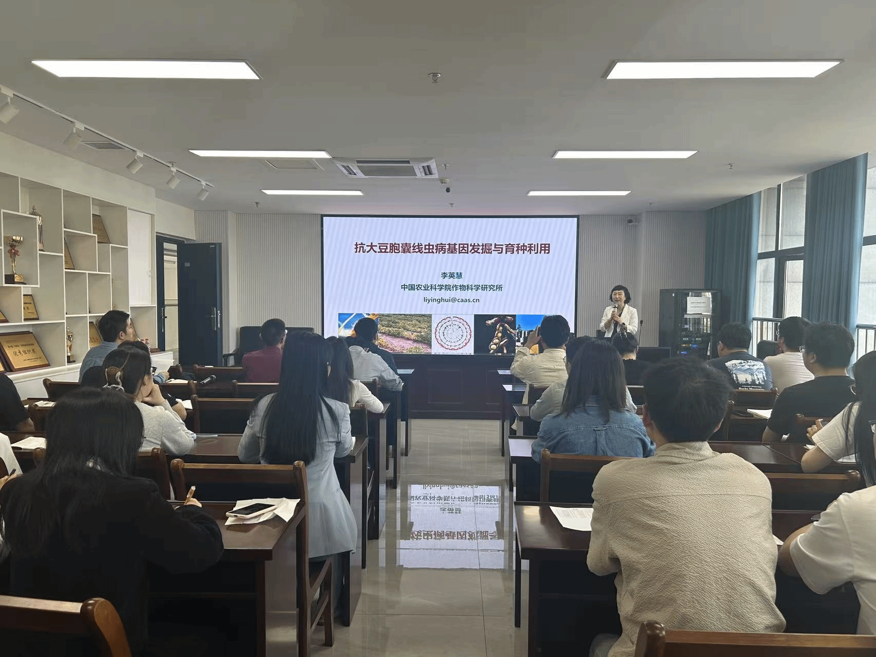 李英慧以“抗大豆胞囊线虫病基因发掘与利用”为题,系统介绍了团队在抗病基因研究领域的突破性成果,报告围绕三方面展开:一是大豆优异种质资源鉴定与抗源哇挖掘,筛选出高抗大豆胞囊线虫种质材料;二是通过群体精细定位和大豆遗传转化,锁定关键抗性基因并揭示抗虫机制;三是开发中豆芯系列芯片,结合抗病性与产量、适应性等性状,开发多性状协同改良策略。研究成果已应用于多个大豆新品种培育,为关键农艺性状改良提供可靠路径。