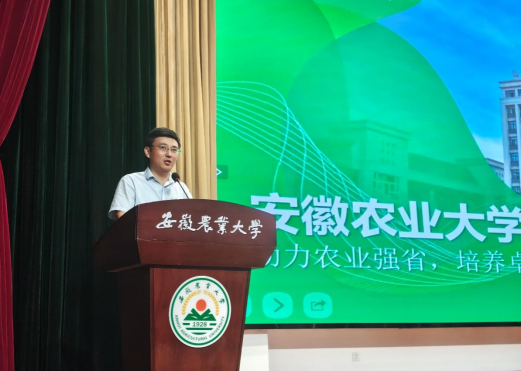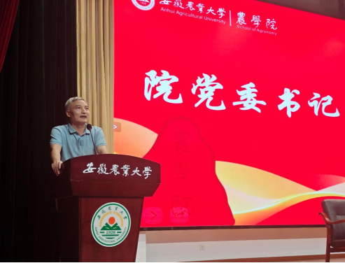 伴随着雄壮的中华人民共和国国歌,大会正式拉开帷幕,全体师生肃立行注目礼,爱国爱校的情怀在报告厅内凝聚升华。院长王晓波代表学院致辞,他从历史沿革、学科建设、师资力量、人才培养等方面系统梳理了农学院与学校同频共振的发展历程,全面展现了学院在服务安徽农业现代化进程中的学科优势与育人成果,并寄语新生,要以“知农爱农、强农兴农”为初心使命,将课堂所学与江淮大地的农业生产实践紧密结合,立大志、成大才,为学校与学院的高质量发展注入青春动能。