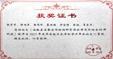 农学院作物生理生态团队研究生张梦梦撰写的会议论文《安徽省主要农作物秸秆资源分布及其综合利用现状》荣获2025年华东地区农学会学术年会论文一等奖,并受邀在学术交流会上进行PPT汇报交流。