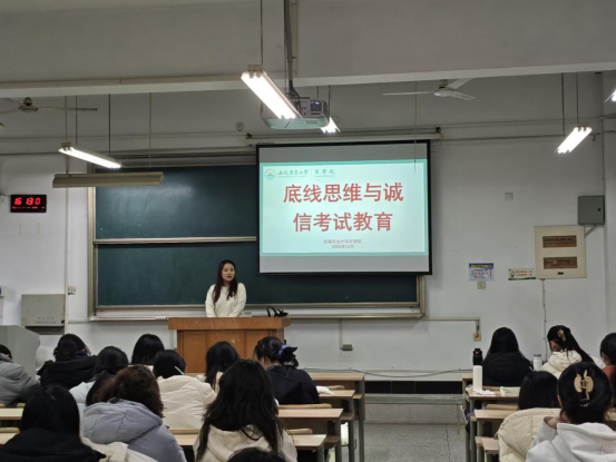 会上,李静围绕“坚守底线、诚信应考”核心主题,系统解读了底线思维的深刻内涵与实践要求,通过典型案例剖析,直观展现违纪作弊的严重后果,并倡导学生干部发挥带头作用,主动传播诚信理念,带动班级形成“以诚信为荣、以作弊为耻”的良好风气。“底线思维让我明白,诚信考试不仅是对学业的负责,更是对个人品德的锤炼”“作为班级学习委员,我会主动组织诚信应考倡议活动,和同学们一起守住学术底线”。