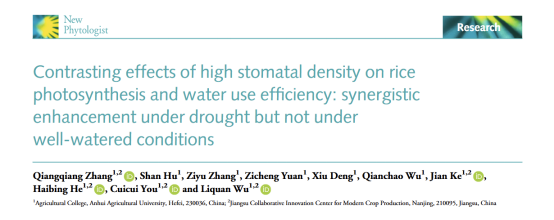 本网讯 近日,安徽农业大学水稻栽培创新团队武立权教授在植物学经典期刊《New Phytologist》在线发表题为“Contrasting effects of high stomatal density on rice photosynthesis and water use efficiency: synergistic enhancement under drought but not under well-watered conditions”的最新研究成果, 首次系统阐明了气孔密度对水稻光合作用和内在水分利用效率的调控作用具有显著的水分条件依赖性,即 高气孔密度在正常供水条件下仅能提高光合速率,无法实现二者的协同改善,但在干旱胁迫下可协同提升水稻光合速率与水分利用效率。该研究为水稻高产抗旱育种提供了重要的理论依据和关键生理靶标。