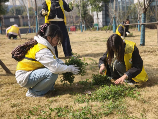活动现场,志愿者们分工协作、干劲昂扬,每一片绿化区域都成为大家锤炼本领、践行劳动精神的“实践阵地”。志愿者们两两结伴、分工协作,有条不紊地推进各项养护工作。在树木养护区,同学们手持小剪刀、园艺剪,小心翼翼地对枯枝、发黄枝、杂乱枝条进行修剪,精准调整树形结构,为新枝萌发腾出充足空间;不少同学主动向现场老师请教,认真学习树木造型的基础技巧,结合树苗生长习性与趋势科学修剪,让树木形态更趋规整美观。在花坛与绿化带中,同学们俯身弯腰、细致劳作,手持小铲子、镊子,逐一拔除杂草,不放过任何一处死角;针对根系较深、难以拔除的杂草,大家相互配合、合力清理,同时顺手捡拾落叶、纸屑等杂物,全力守护绿化区域的整洁有序。此外,部分志愿者主动承担枝叶清运任务,将修剪下来的枯枝败叶分类收集、统一转运处理,用细致行动为校园环境“梳妆打扮”,让春日校园更显清爽雅致。