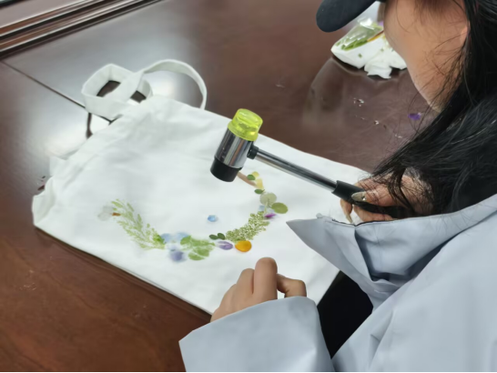 活动现场,同学们在工作人员的引导下,精心挑选形态各异的叶片与花瓣,以素布为底、以木锤为笔,通过固定、敲拓、揭取等一系列步骤,将春日草木的鲜活色彩与细腻纹理定格在布料之上。大家专注于指尖与自然的微妙互动,在清脆的敲击声中沉浸式感受草木汁液晕染的奇妙过程,无需深厚绘画功底,只需一颗沉静用心,每一件作品都承载着自然之美与个人巧思,尽显独特韵味,现场氛围沉静治愈。